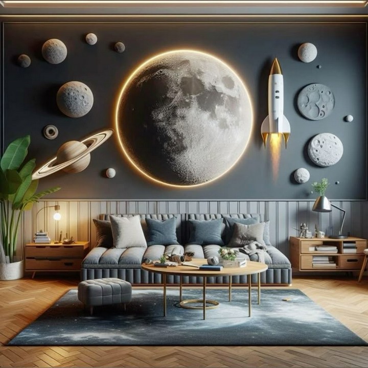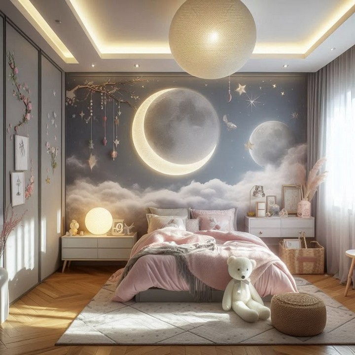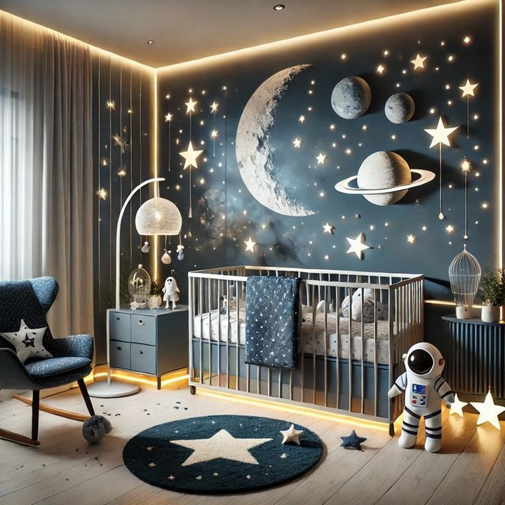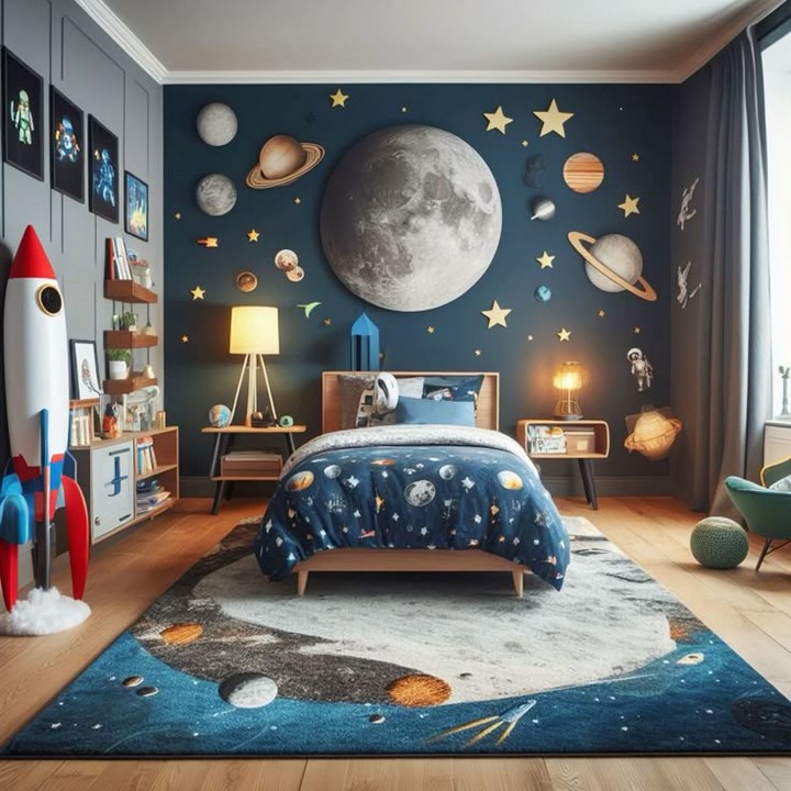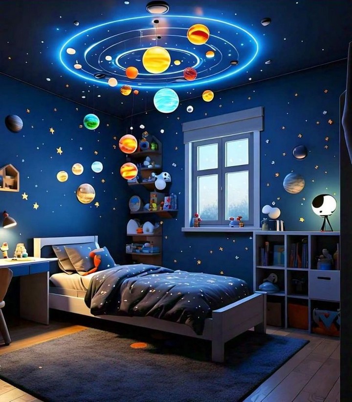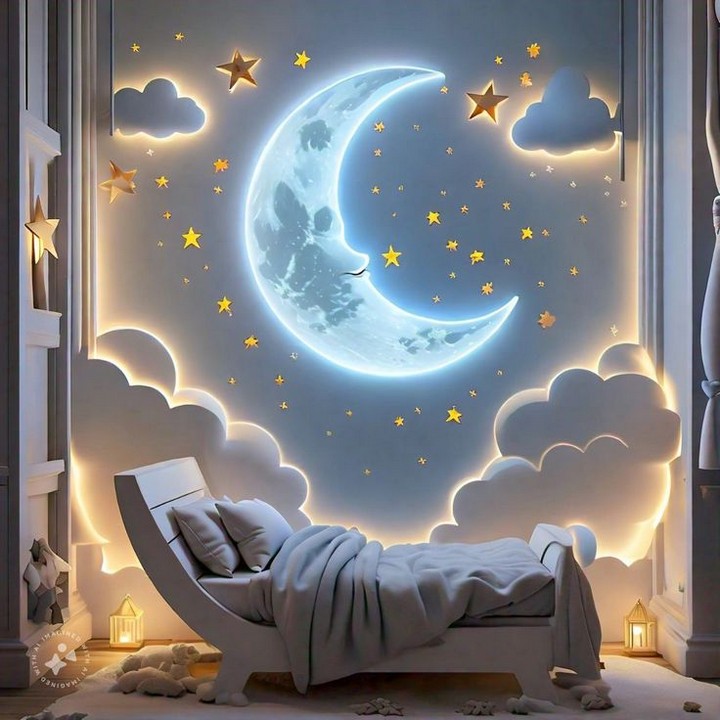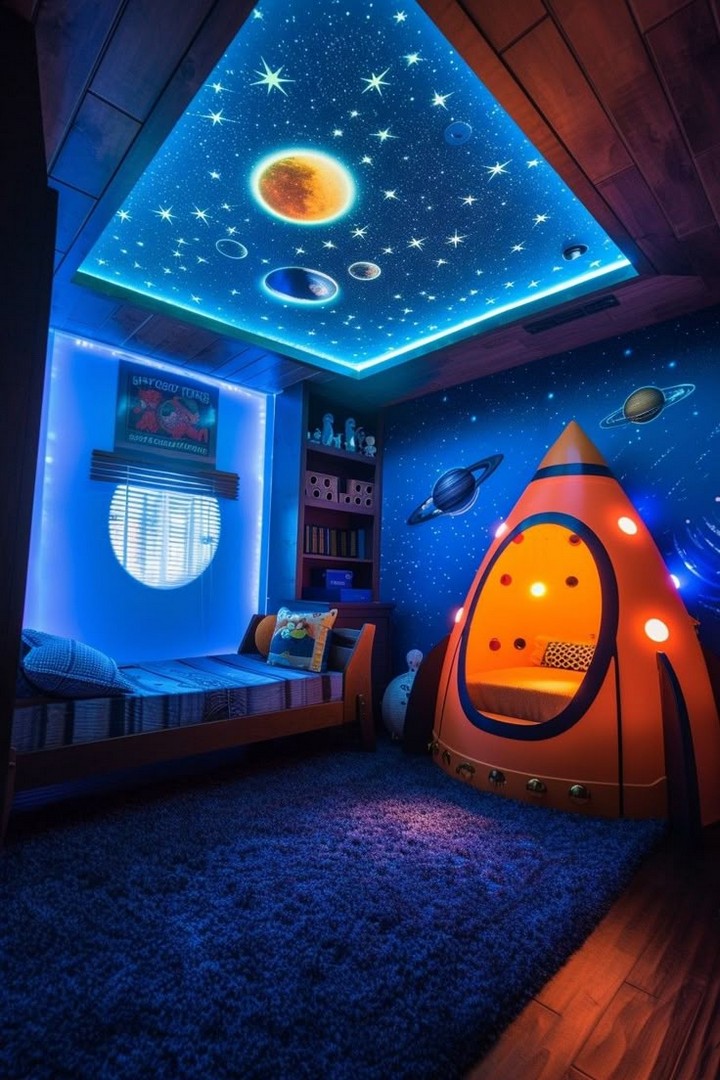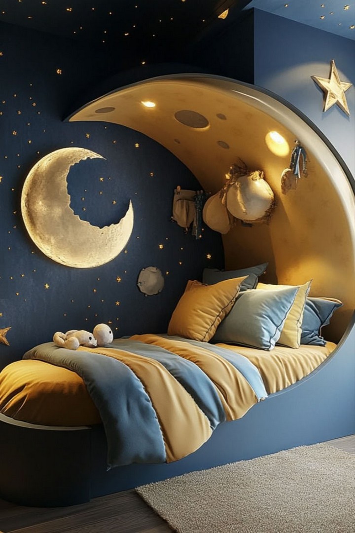 Amp up the celestial theme with LED light strips, fiber-optic star ceilings, and glowing moon lamps. Use deep purples and silvers for a futuristic look. It’s visually stunning and imaginative—ideal for night owls and dreamers.