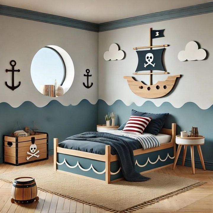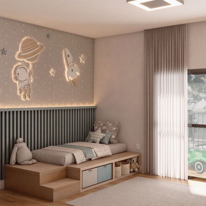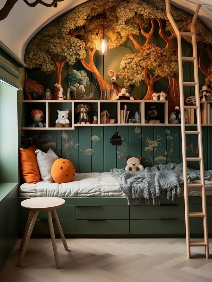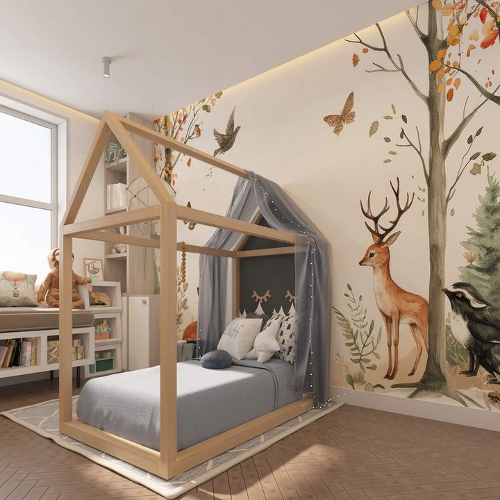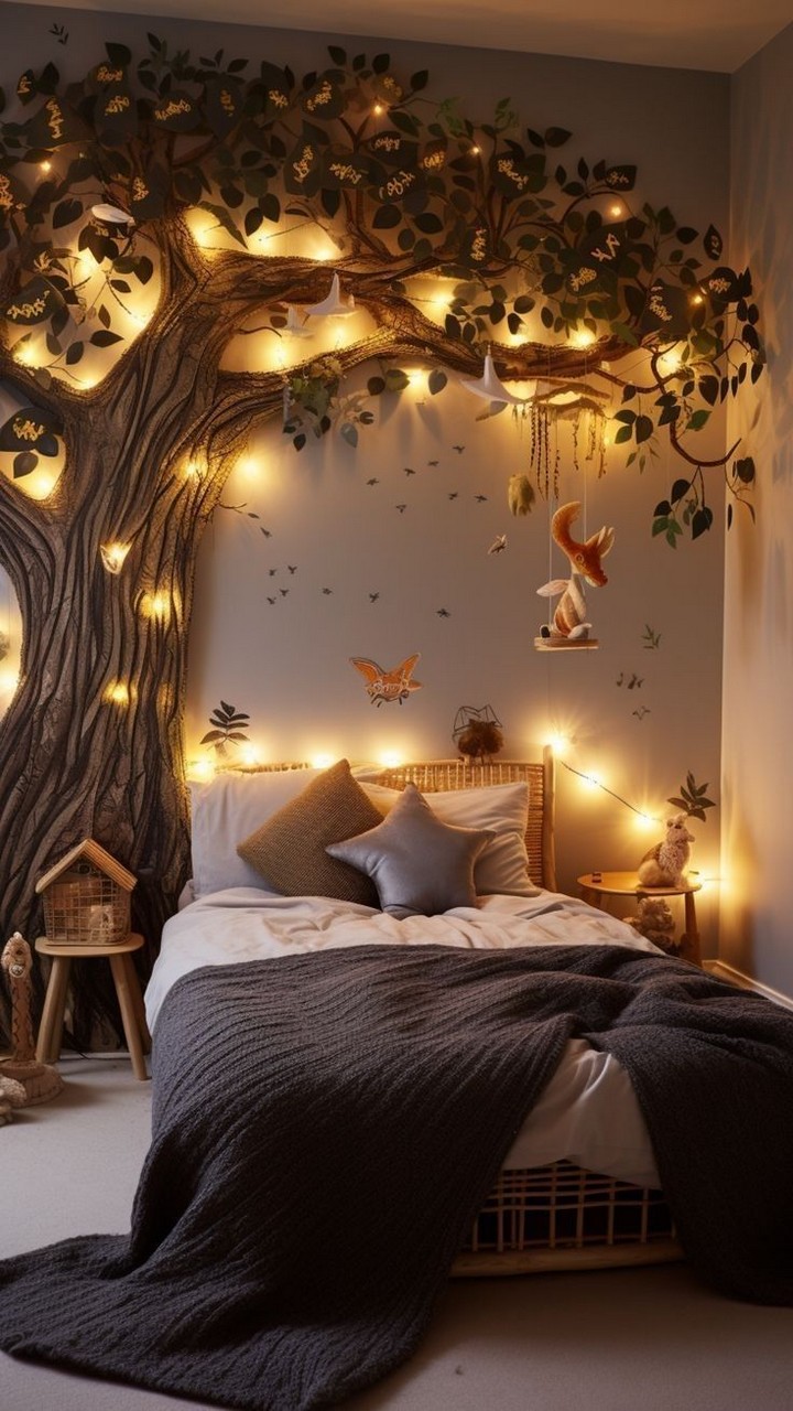 Create a magical forest indoors with tree murals, fairy lights, and woodland animal décor. A bed shaped like a treehouse or placed under a leaf canopy adds whimsical charm. Great for imaginative kids who love fairy tales and outdoor adventures.