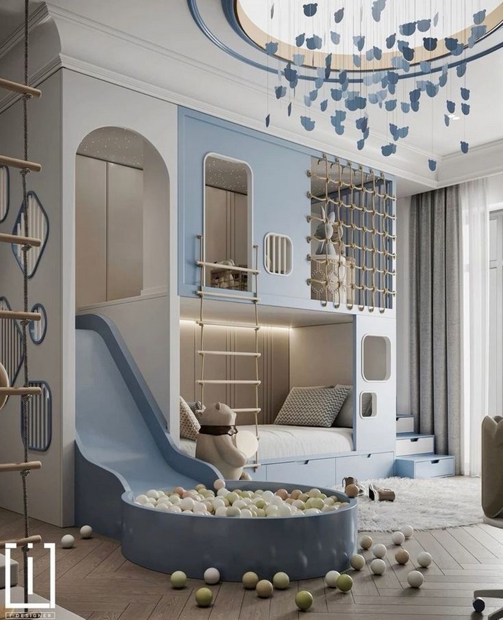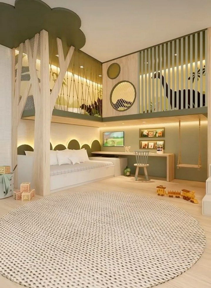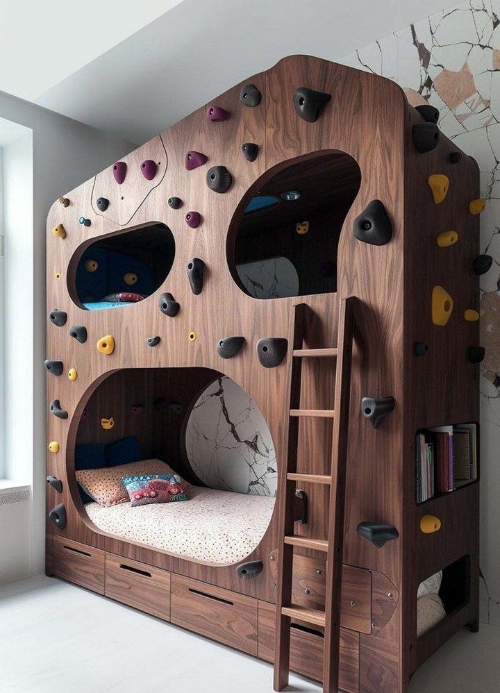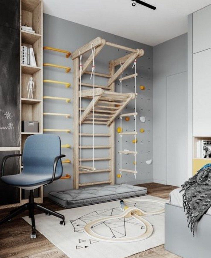 Install a climbing wall, rope ladder, or monkey bars to turn the room into a mini jungle gym. Use motivational wall art and nature colors to keep it energetic. A great way to channel high energy into play and growth.