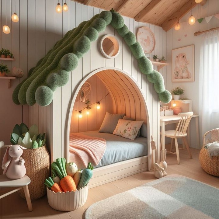 Sprinkle in fairy lights, floral garlands, and whimsical woodland details. A flower-shaped rug or mushroom stool adds extra charm. Encourage imaginative play with miniature fairy houses or enchanted forest murals. Ideal for kids who believe in magic and fairy tales.
