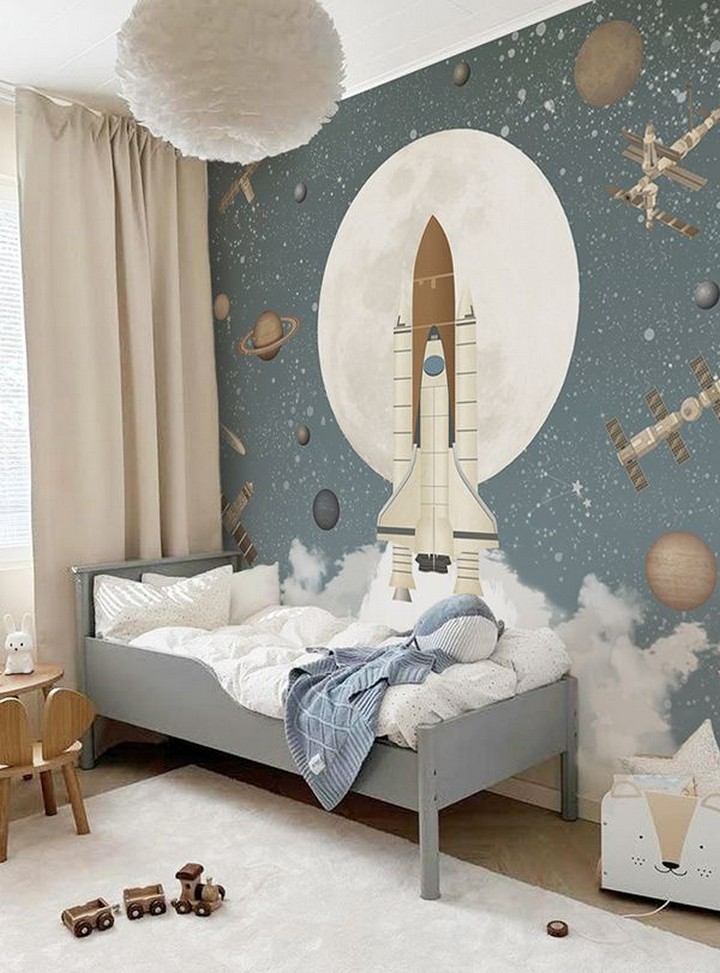 Use scenic wallpaper or murals of mountains, trees, and wildlife. Wood accents and nature-themed decor create a rugged yet cozy look. Encourage exploration with binoculars, trail maps, and camping gear decor.