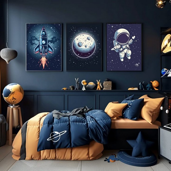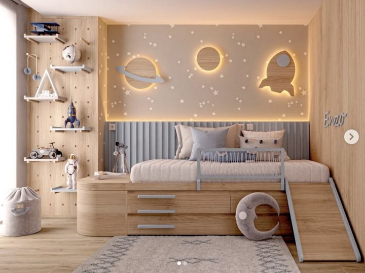 For curious minds, add educational wall posters, a solar system mobile, and clear jars for “experiments.” A microscope, maps, or science kits displayed on floating shelves complete the look. Fun and functional for growing minds.