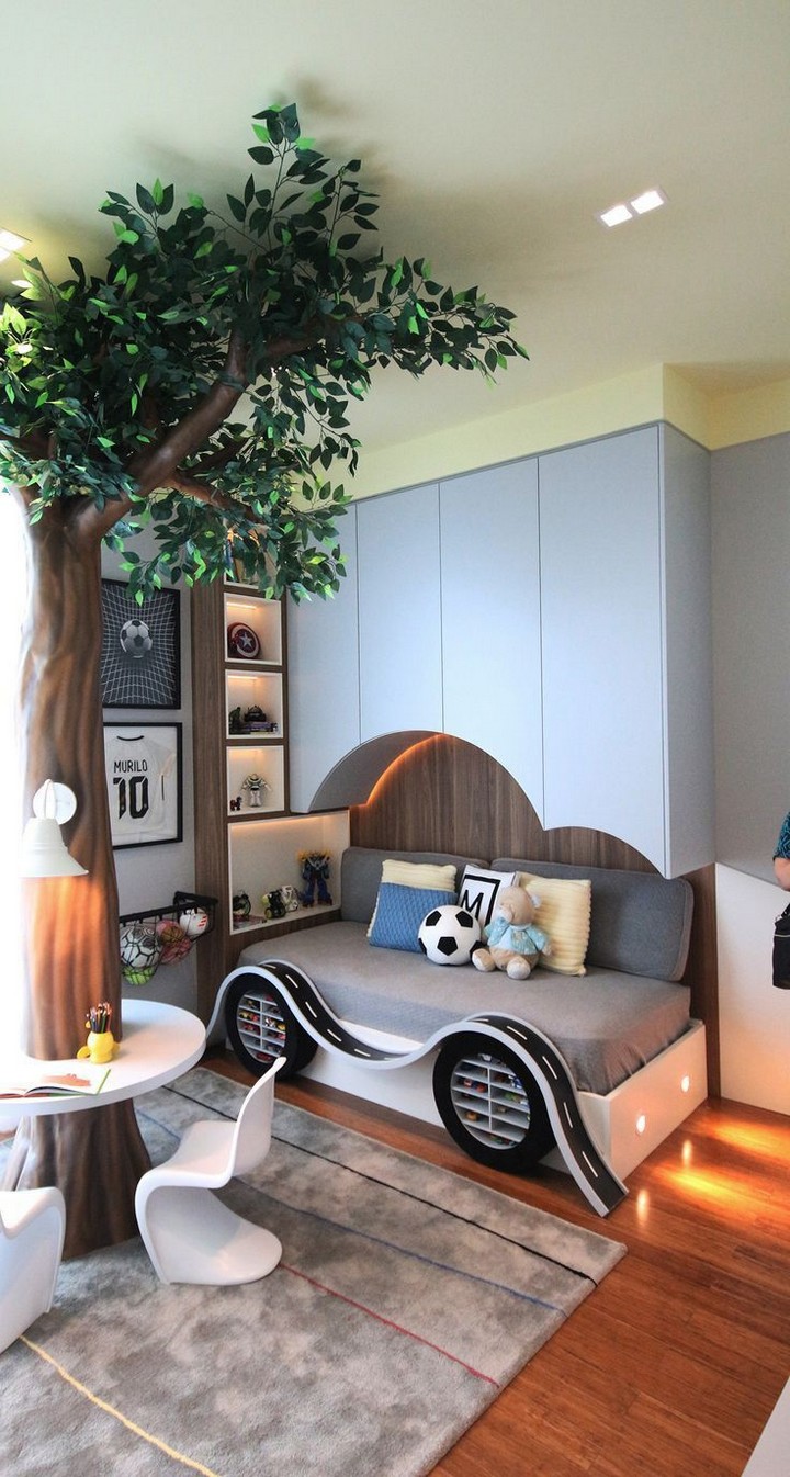 Design a retro garage vibe with classic car decals, traffic signs, and a race car bed. Use checkerboard flooring and fuel-can inspired storage bins for an authentic touch. Perfect for kids obsessed with speed and engines.