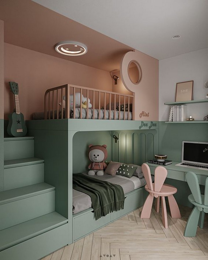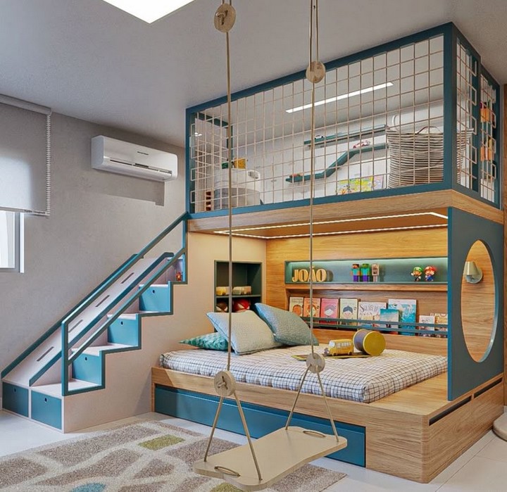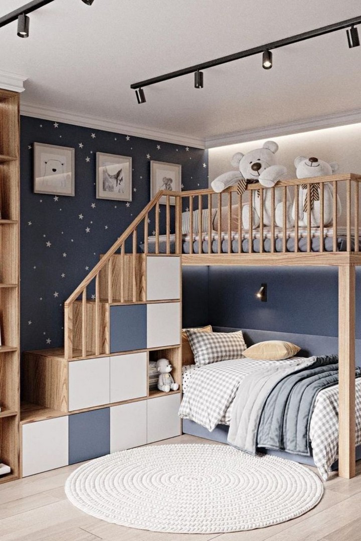 Elevate the bed to open floor space for study or play below. Use compact storage units, LED lights, and a modern color scheme. Perfect for maximizing floor area in small bedrooms.