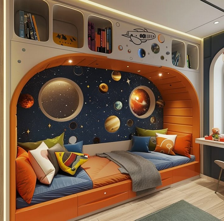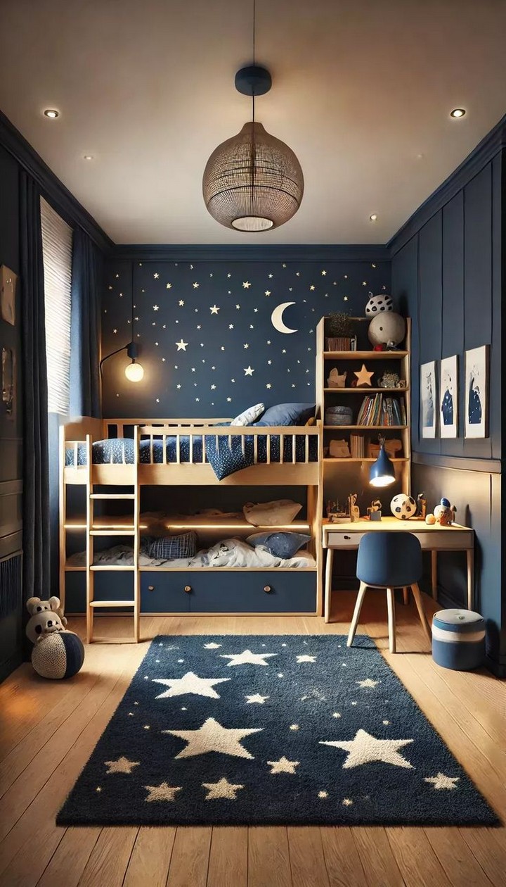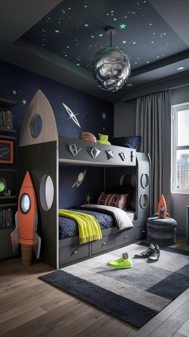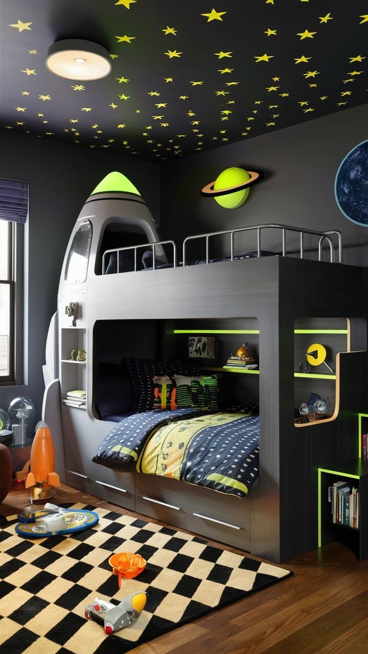 Combine function and fun with a space-themed bunk bed setup. Use glow-in-the-dark stars, astronaut bedding, and rocket ship shelves. Ideal for siblings sharing a room or sleepover-ready setups.