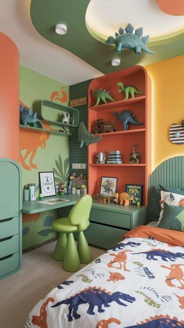 Turn the room into a wild adventure with leafy wallpaper, animal prints, and earthy tones. Add plush animal toys and a canopy over the bed to create a jungle hideout that fuels play and imagination.