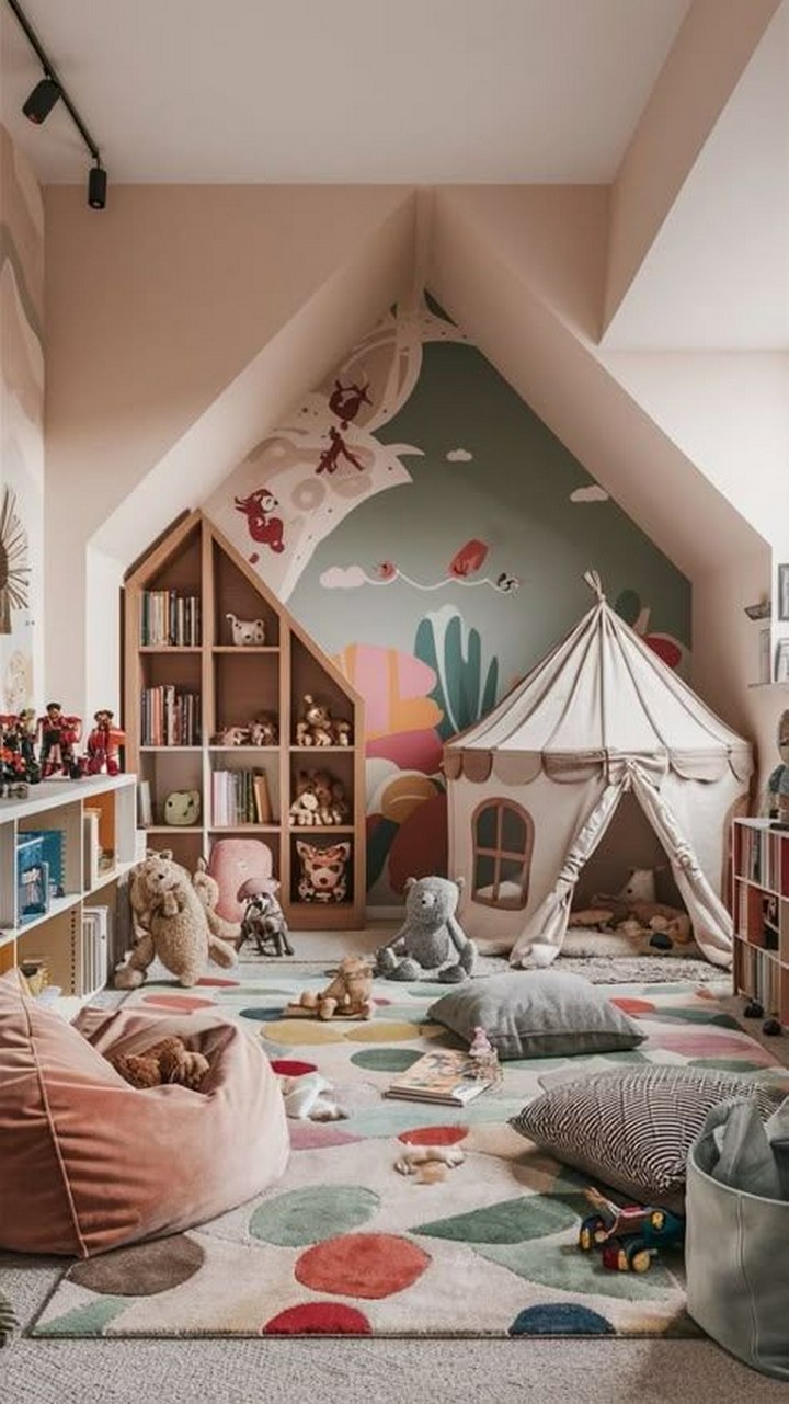 Incorporate wall puzzles, Rubik’s cubes, and board-game decor. Use interactive wall panels or oversized game pieces. It’s a playful, smart space for kids who love challenges and critical thinking.