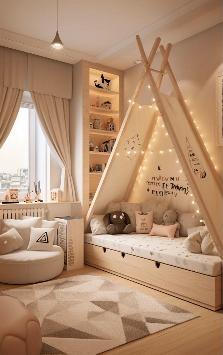 Set up a tent or teepee in the corner, use sleeping bag-style bedding, and decorate with lanterns and nature motifs. A fun, playful setup that brings the outdoors inside.
