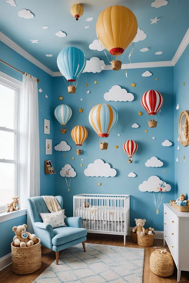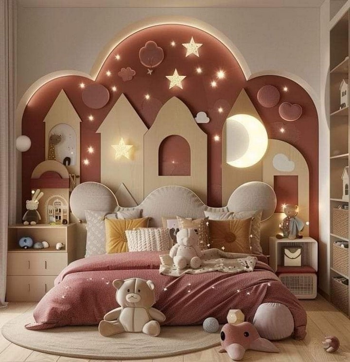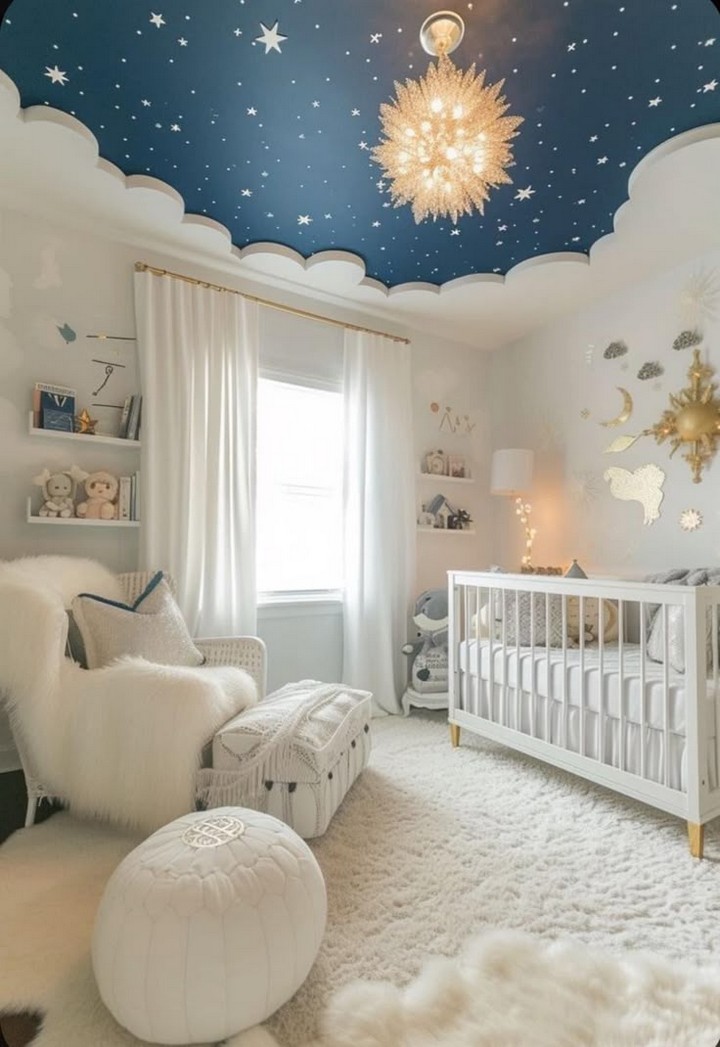 Soften the space with pastel pinks, blues, and mint greens. Incorporate cloud-shaped shelves, light wood furniture, and fairy lights for a dreamy and soothing atmosphere.