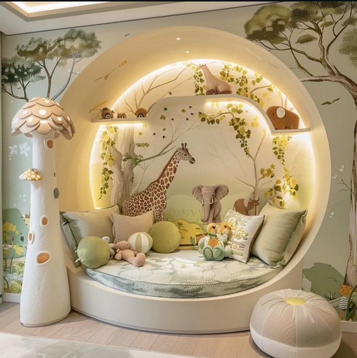 Create an animal-lover’s paradise with jungle murals, safari prints, and plush zoo animals. Use earthy tones with bright accents to represent various habitats. Add storage bins labeled with animals for a playful, educational touch. This interactive space encourages curiosity about wildlife and geography.