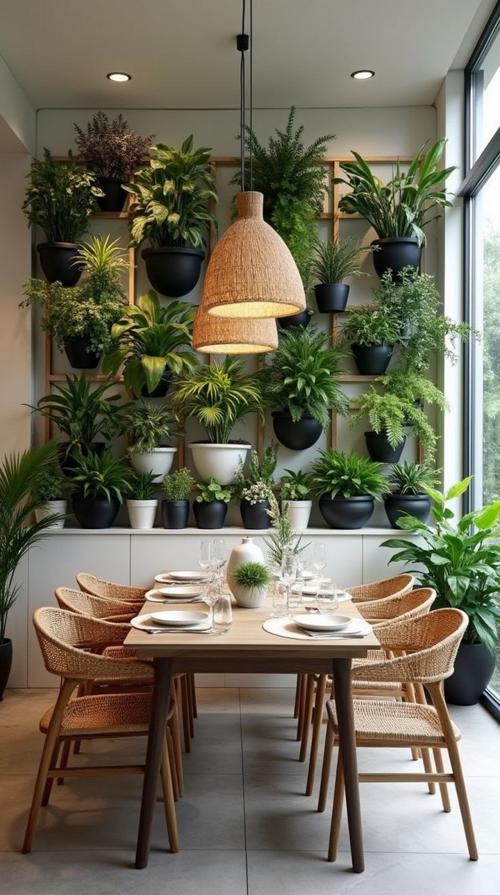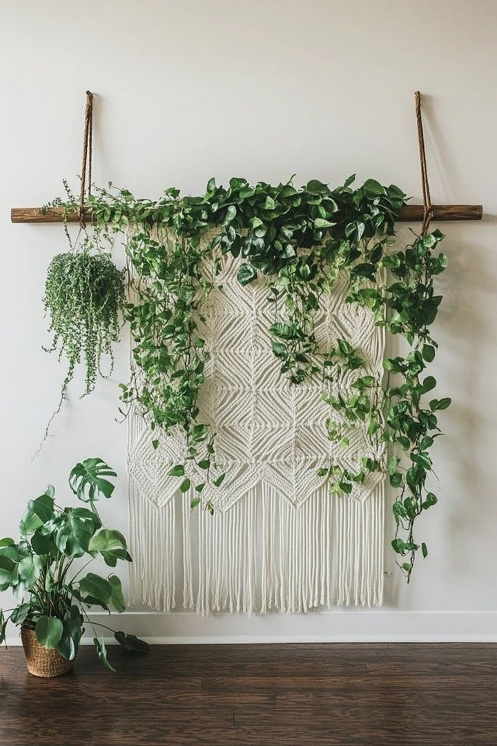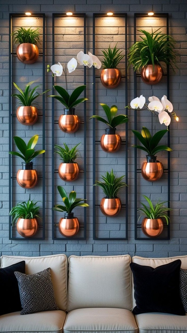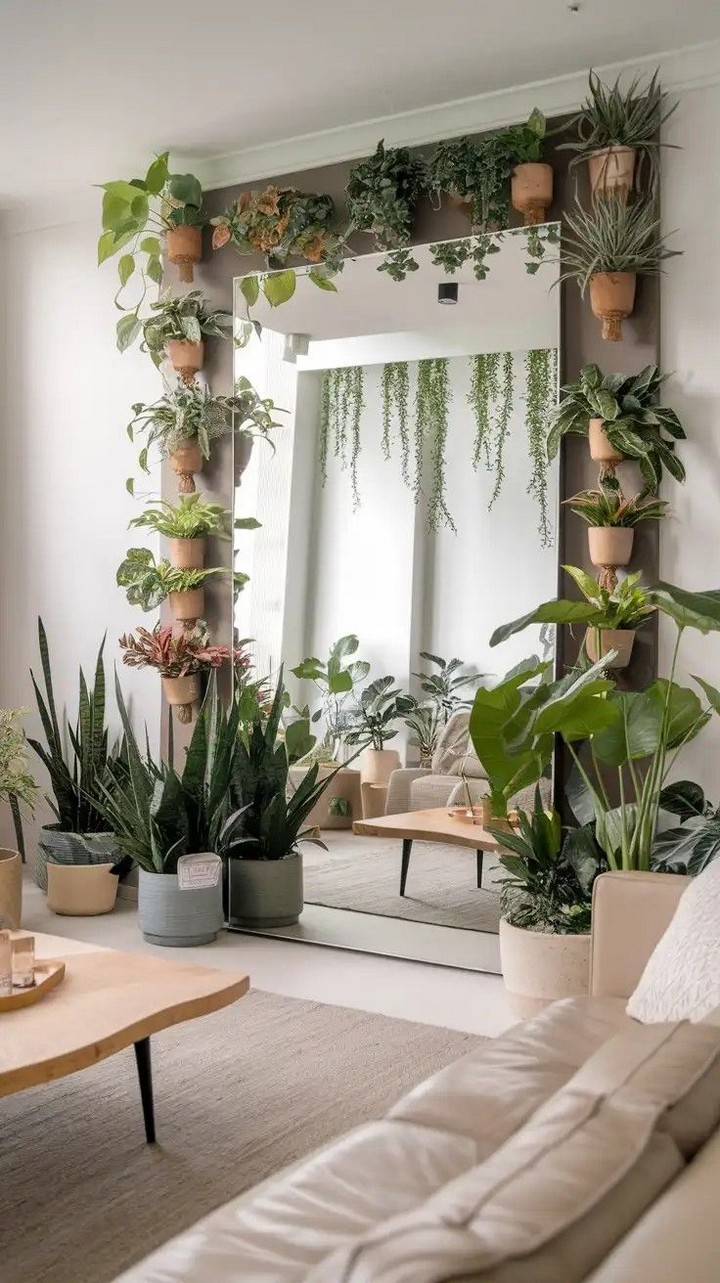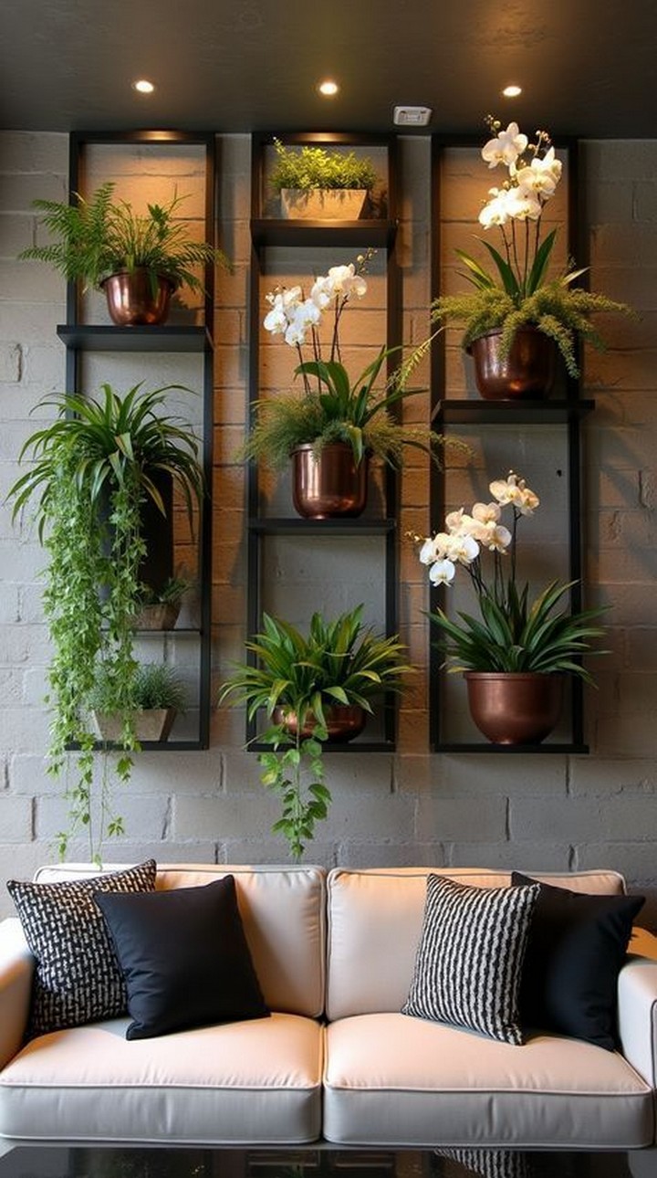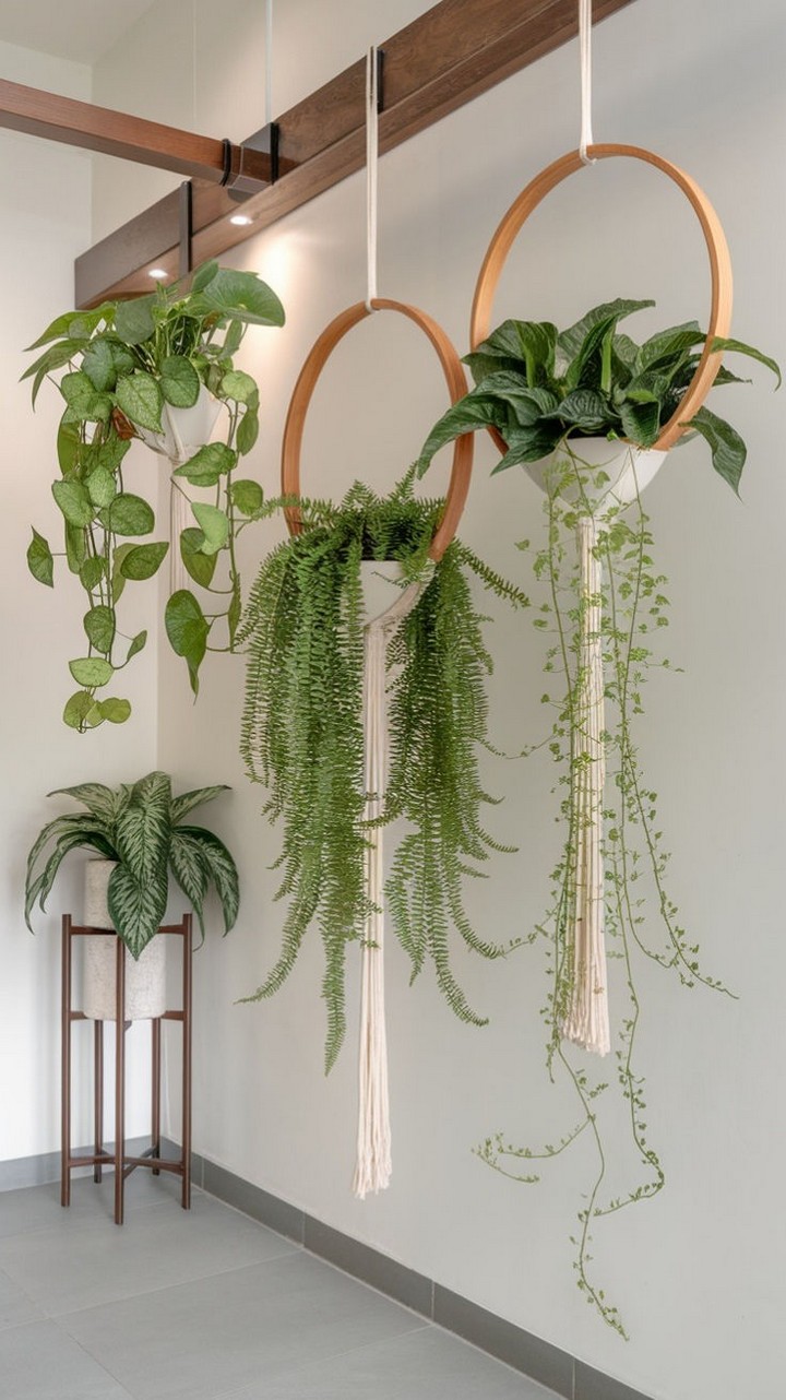 26. Statement Plant Wall: Coordinated collection of hanging plants creating a living tapestry effect. Mix textures, leaf shapes, and trailing lengths for a dramatic feature wall that becomes room-defining artwork.
