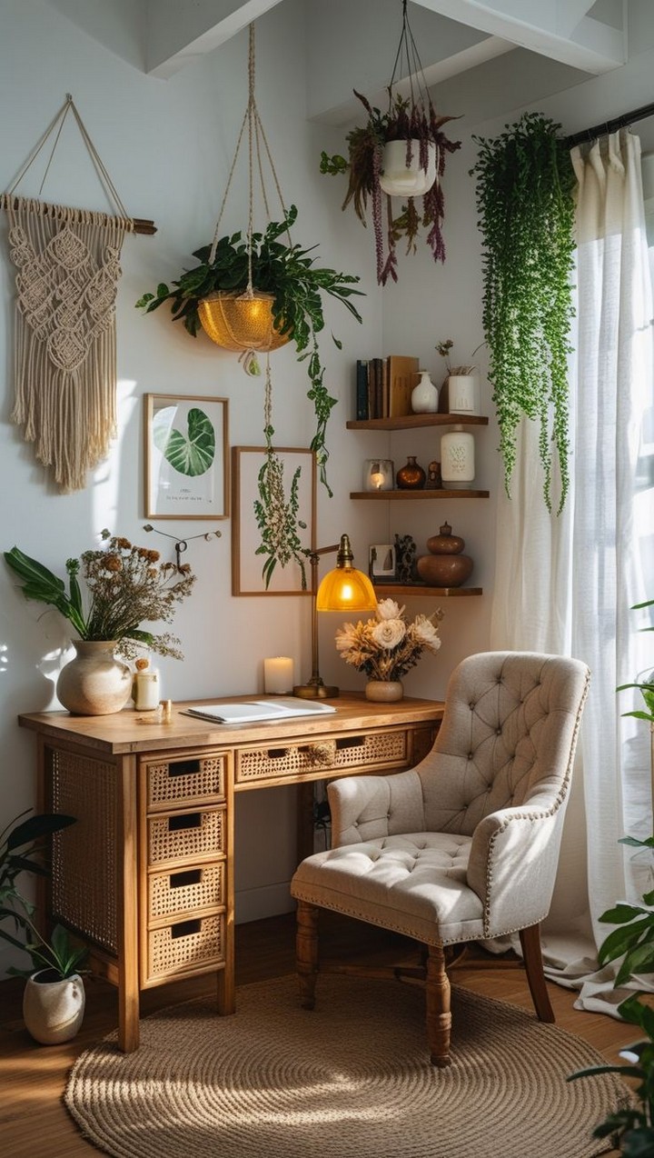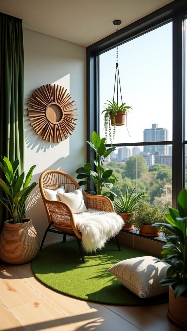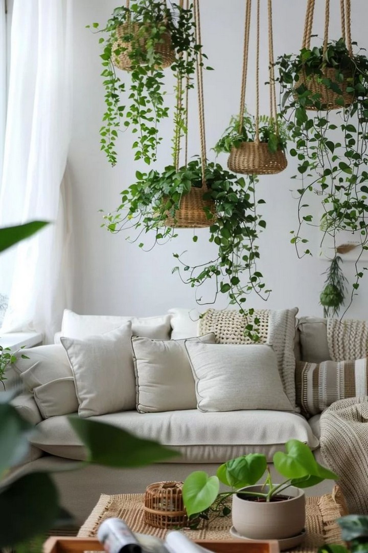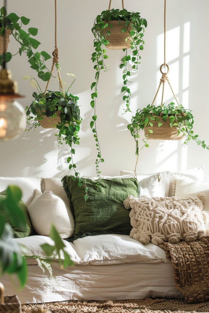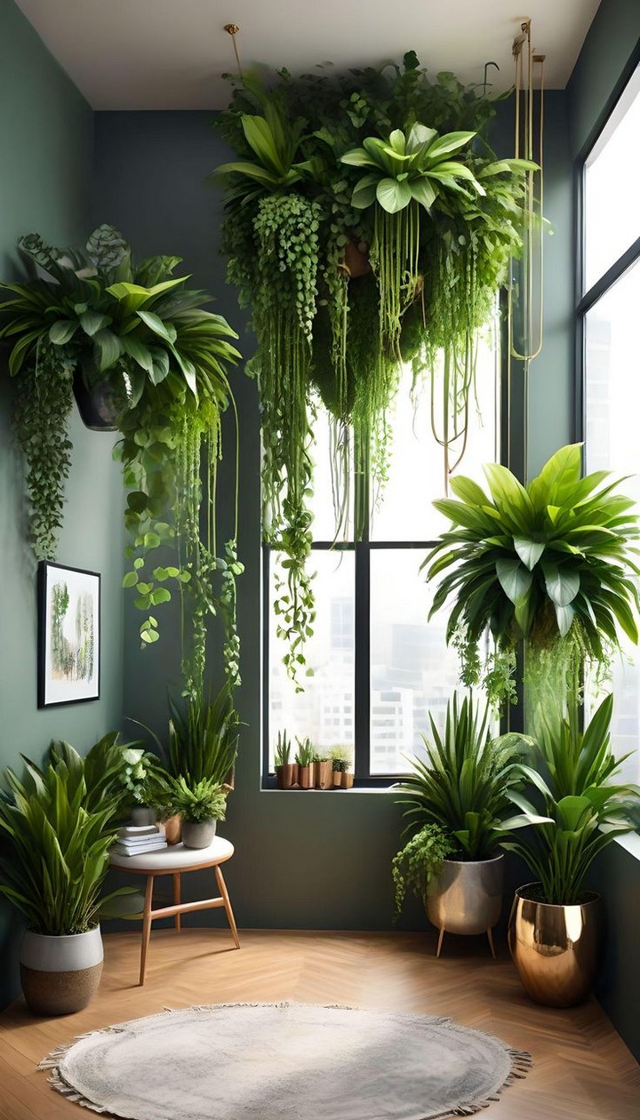 28. Reading Nook Plant Canopy: Cluster of overhead plants creating a green sanctuary around a favorite chair. This arrangement enhances concentration and relaxation while designating a special retreat space.