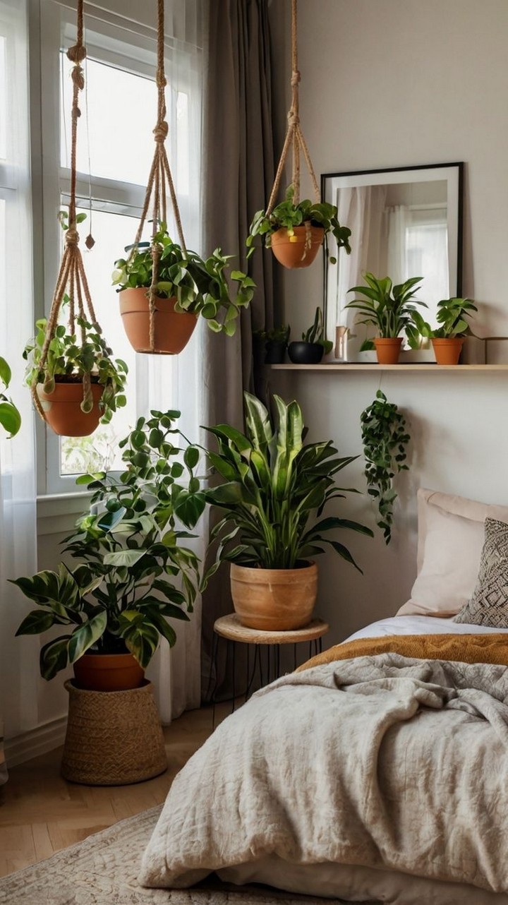 38. Bedroom Corner Plant Collection: Transform dead corner spaces with multi-level hanging arrangements. These lush displays create focal points in otherwise unused vertical areas.