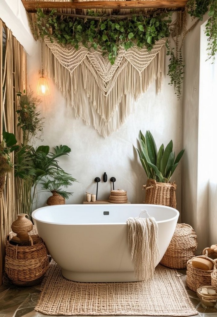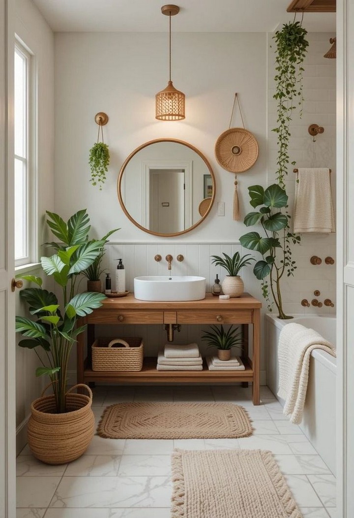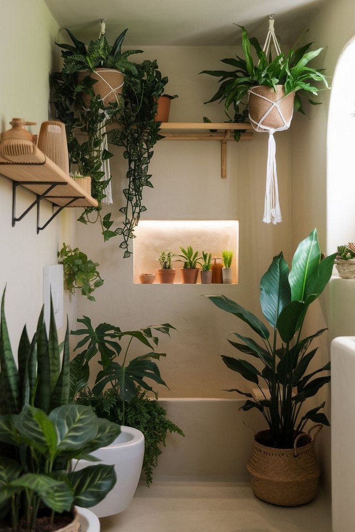 31. Shower Plant Hanger: Humidity-loving varieties like ferns and peace lilies suspended near shower enclosures. These plants thrive in natural bathroom moisture while purifying steamy air.