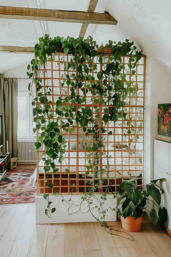 30. Room Divider Plant Screen: Suspended plants that help define separate areas in open floor plans. These living dividers provide privacy and zone definition without blocking light or requiring construction.
