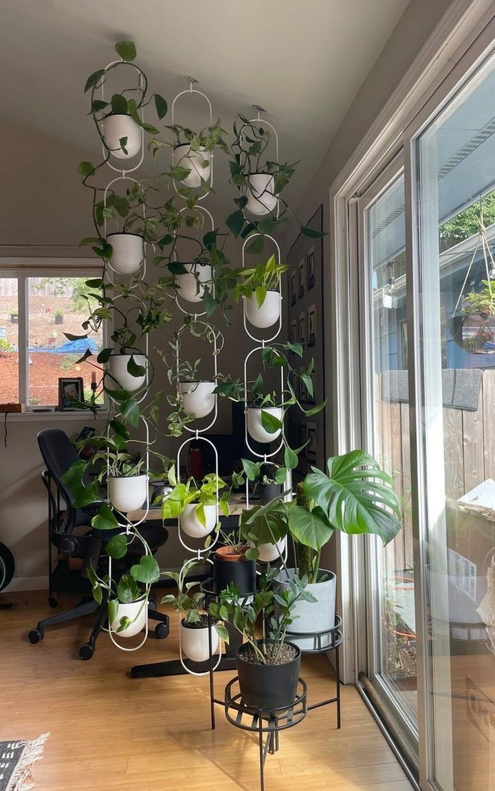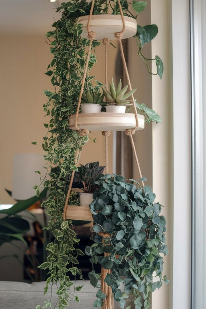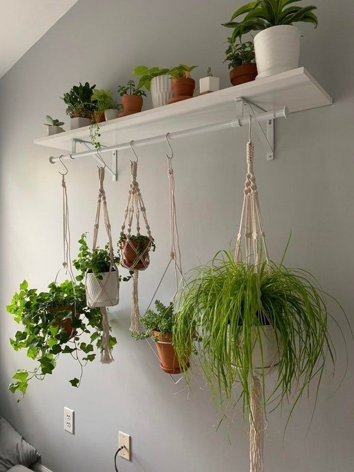 19. Tension Rod Plant Display: Non-permanent installation perfect for renters. Suspend plants between walls without damaging surfaces, creating a vertical garden that can move with you.