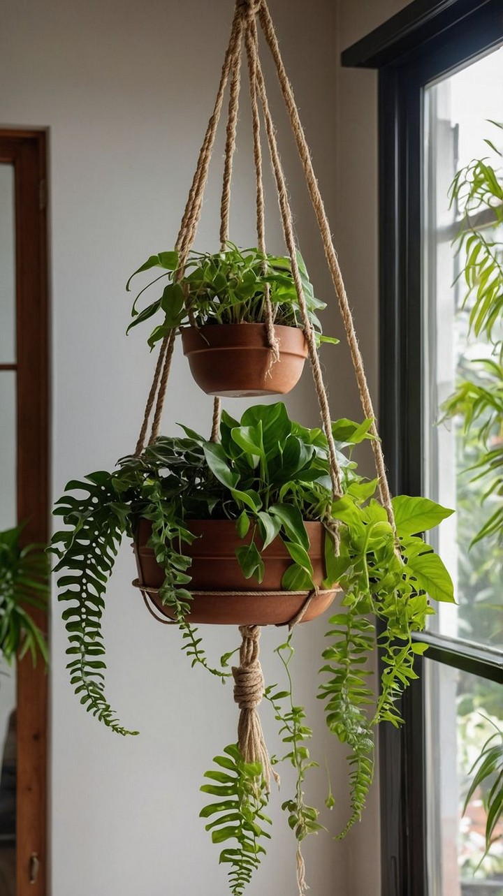 4. Double-Decker Macramé: Two-tiered design accommodating multiple plants in a vertical arrangement. Perfect for showcasing a “plant family” with similar care needs in spaces with limited width.