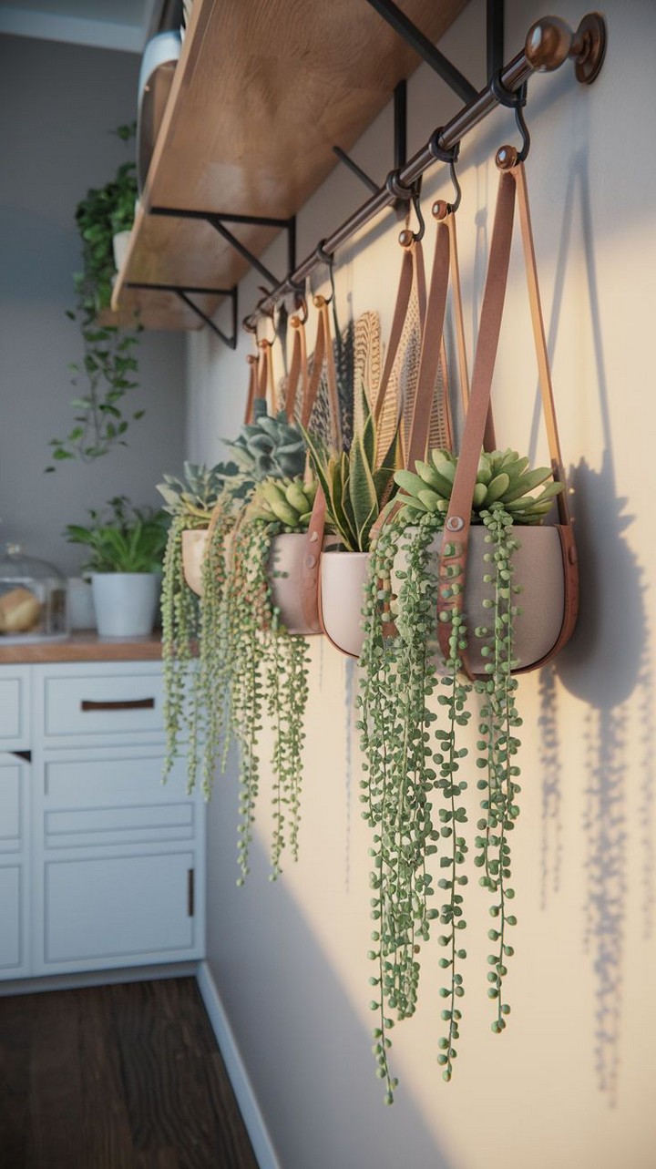 25. Kitchen Corner Plant Station: Multi-level hanging arrangement utilizing often-unused kitchen corners. Combine different heights and plant varieties to create a verdant focal point in an otherwise overlooked space.