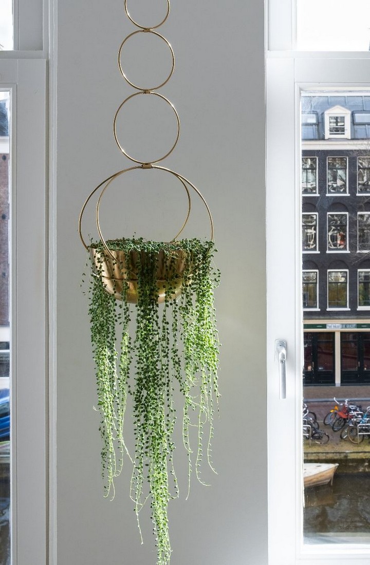 10. Gold Hoop Planters: Minimalist metallic circles that create a floating effect. Plants appear to hover in midair when placed in these sleek, contemporary hangers that celebrate negative space.