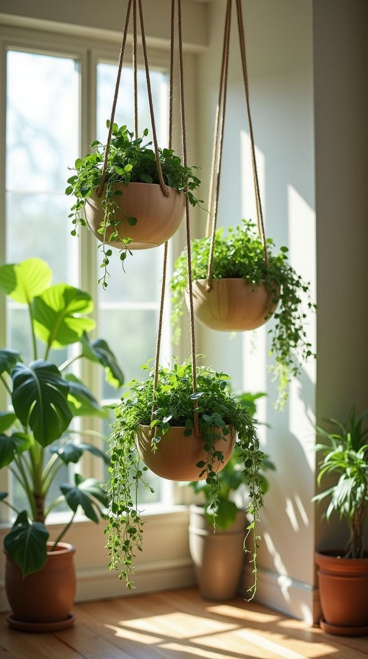 27. Window Frame Hanging Garden: Plants suspended from curtain rods or dedicated window hardware. This arrangement filters light beautifully while creating privacy and a connection to nature.