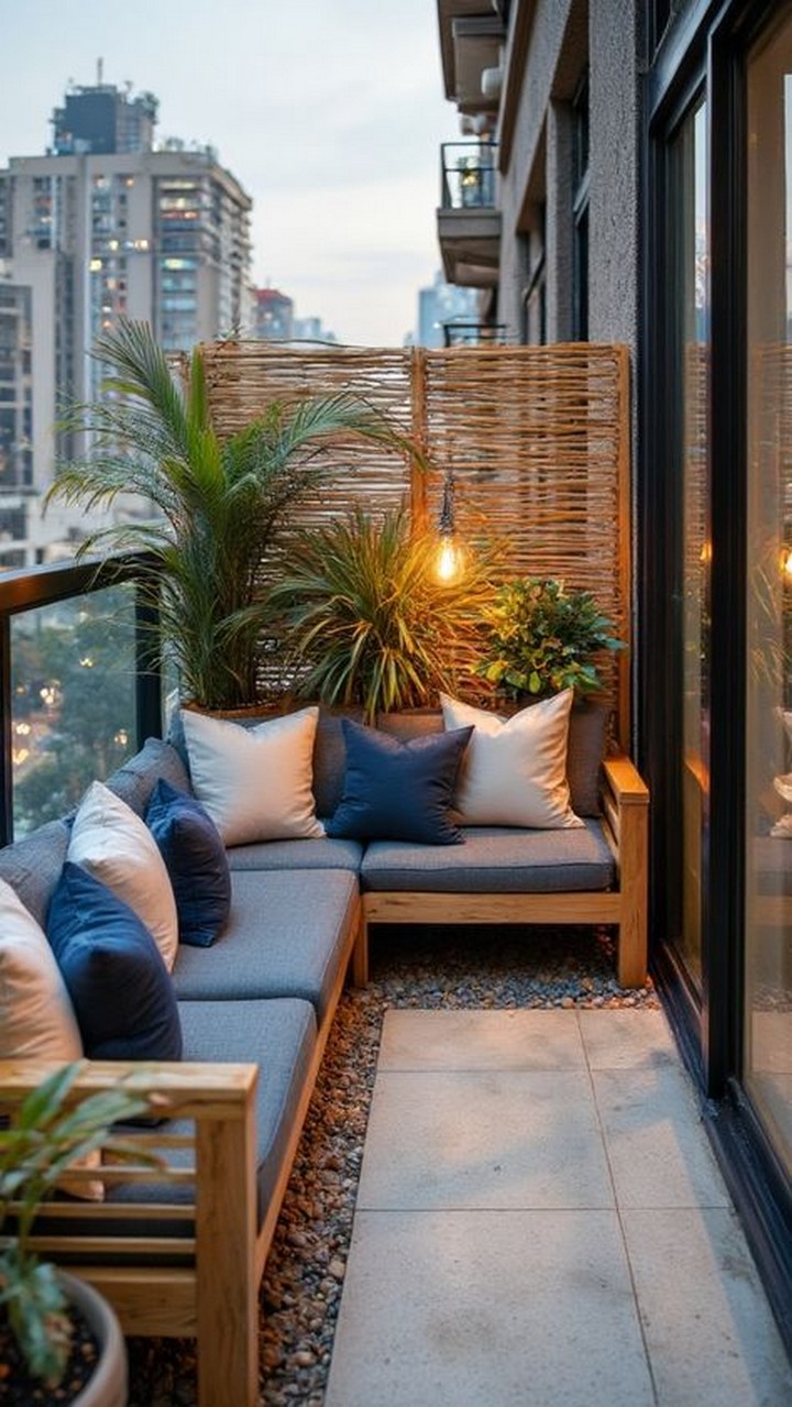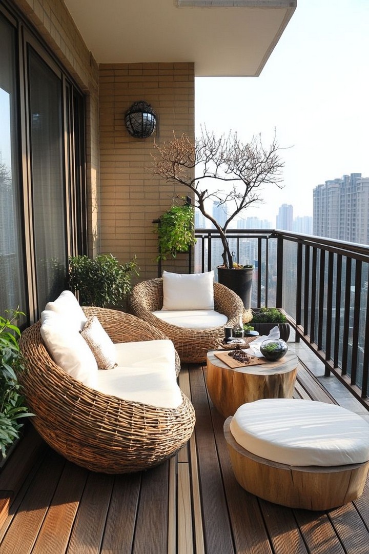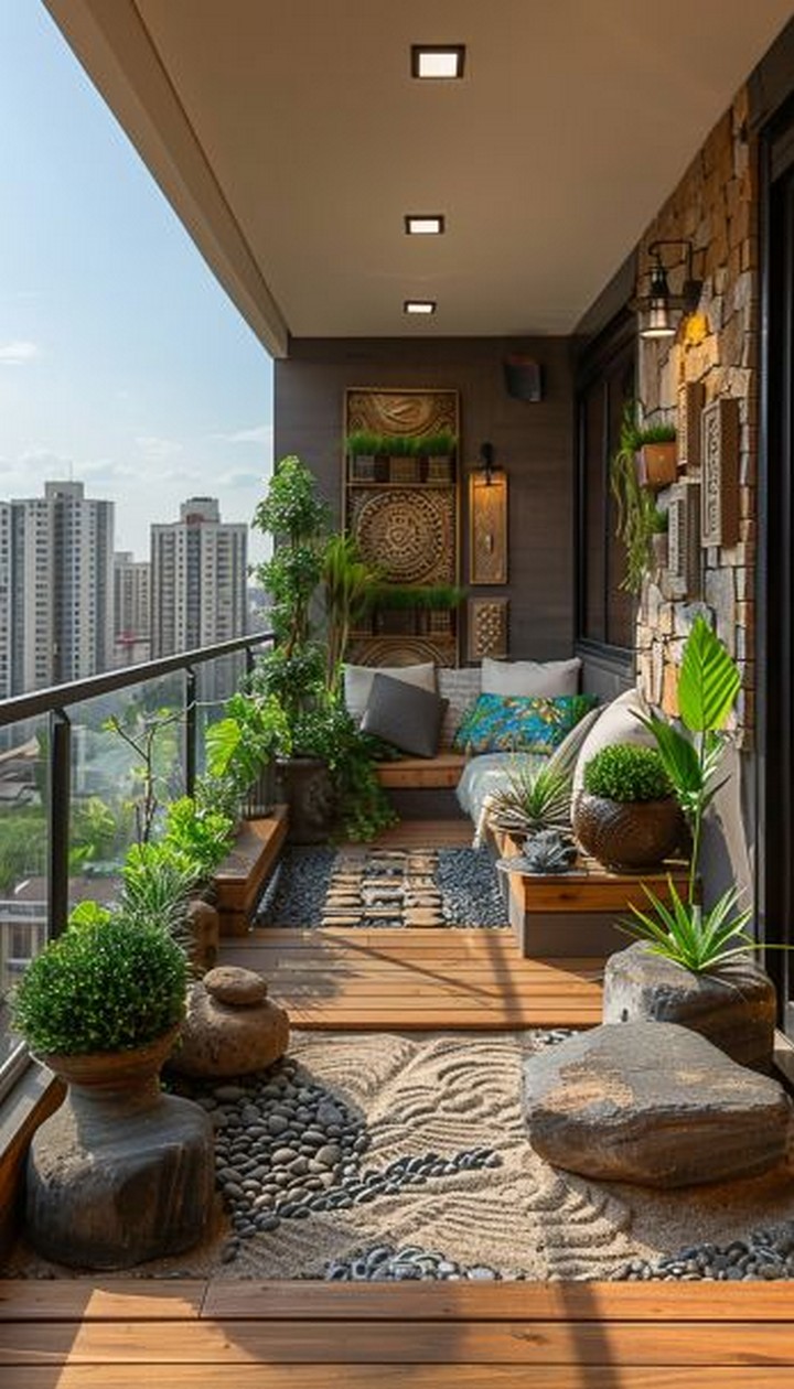 Create tranquility with limited elements: perhaps a single perfect bonsai, a small water feature, and a comfortable cushion on an uncluttered balcony.