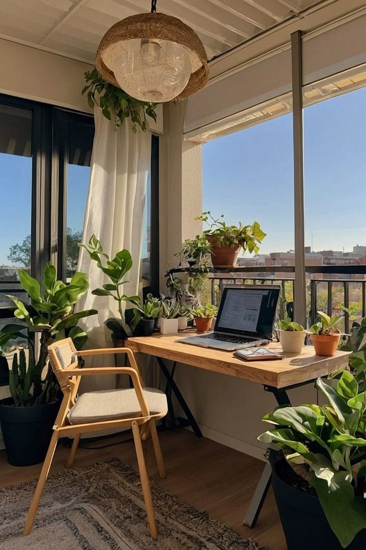 A narrow wall-mounted desk, comfortable chair, and good lighting transform a section of balcony into a refreshing work alternative.