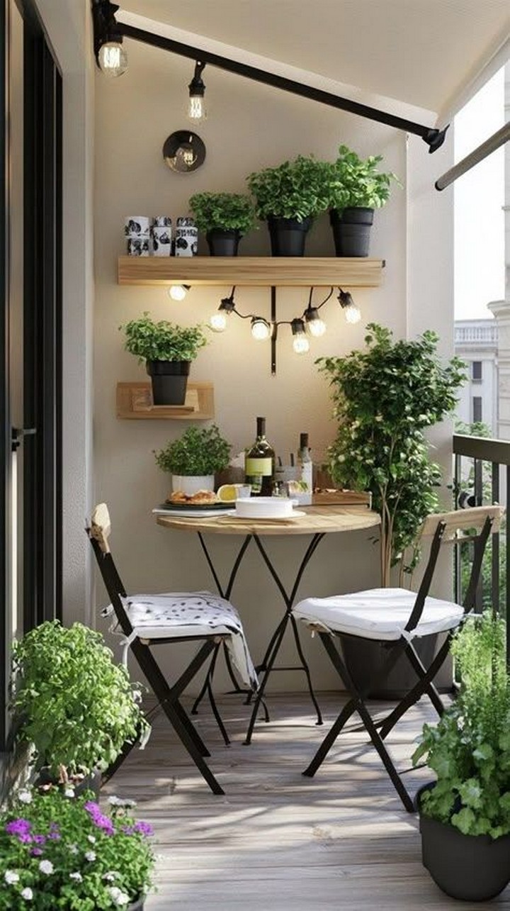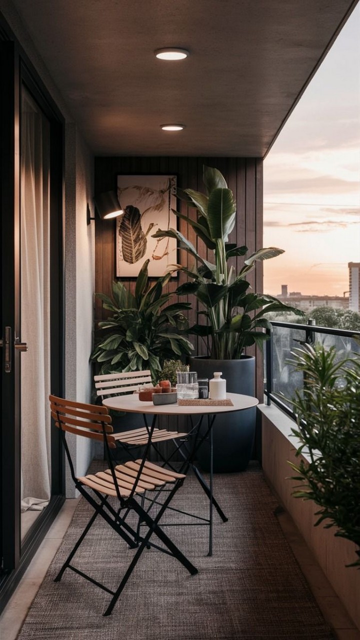 A classic small-scale bistro table with two chairs offers functionality without overwhelming the space, perfect for morning coffee or intimate meals.