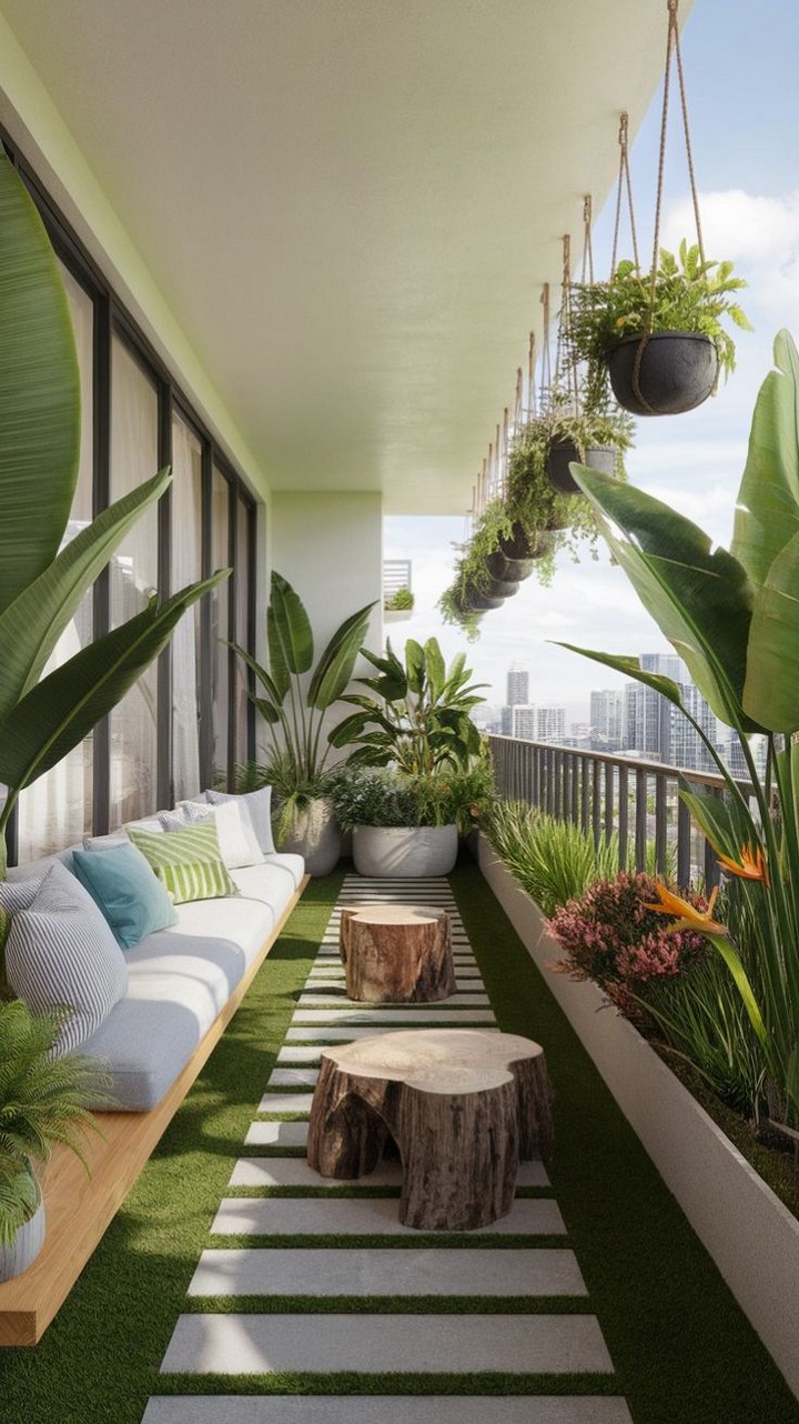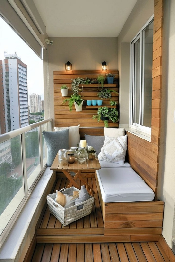 Lining the edges of your balcony with narrow planters, seating, or storage creates a defined space while leaving the central area open for movement or additional temporary uses.
