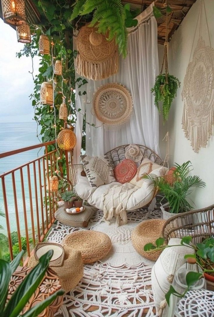 Weather-resistant floor cushions, poufs, and low tables create a casual, bohemian atmosphere that can accommodate multiple people without bulky furniture.