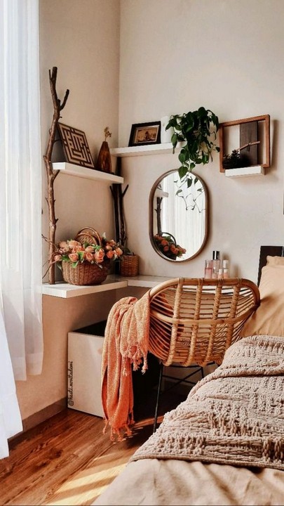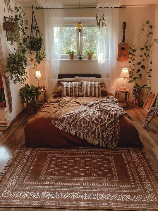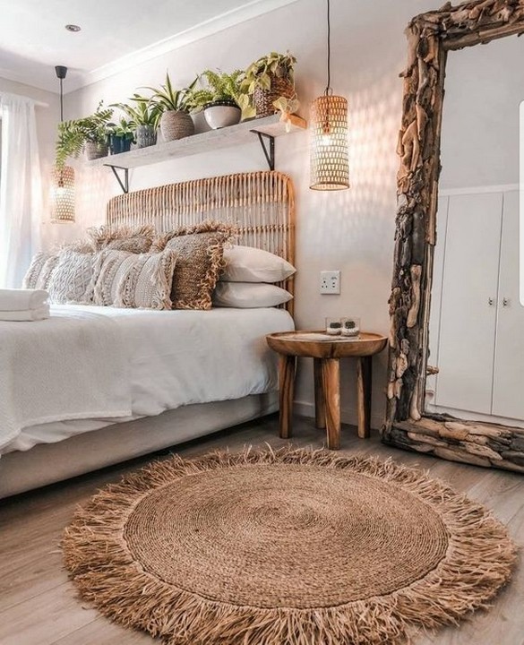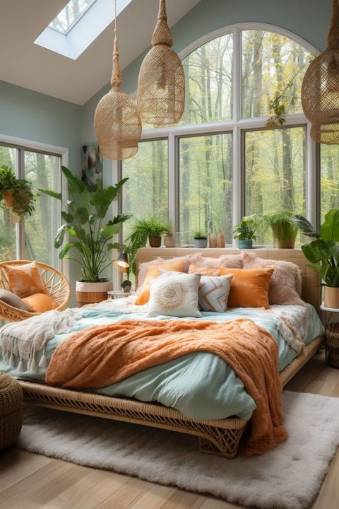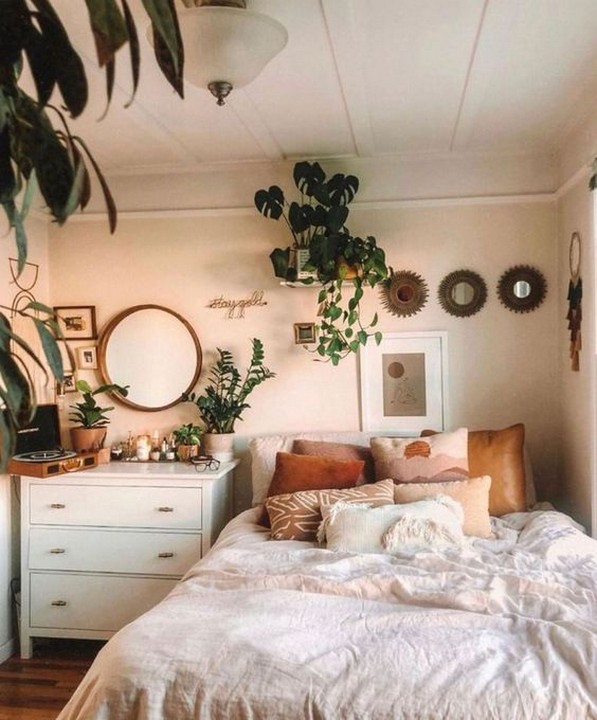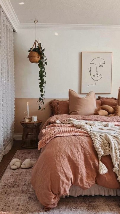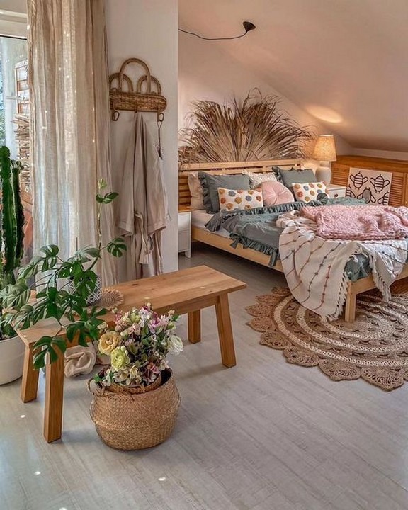 Potted succulents and indoor plants in terracotta pots add a touch of greenery to the room.