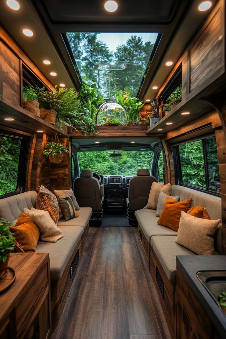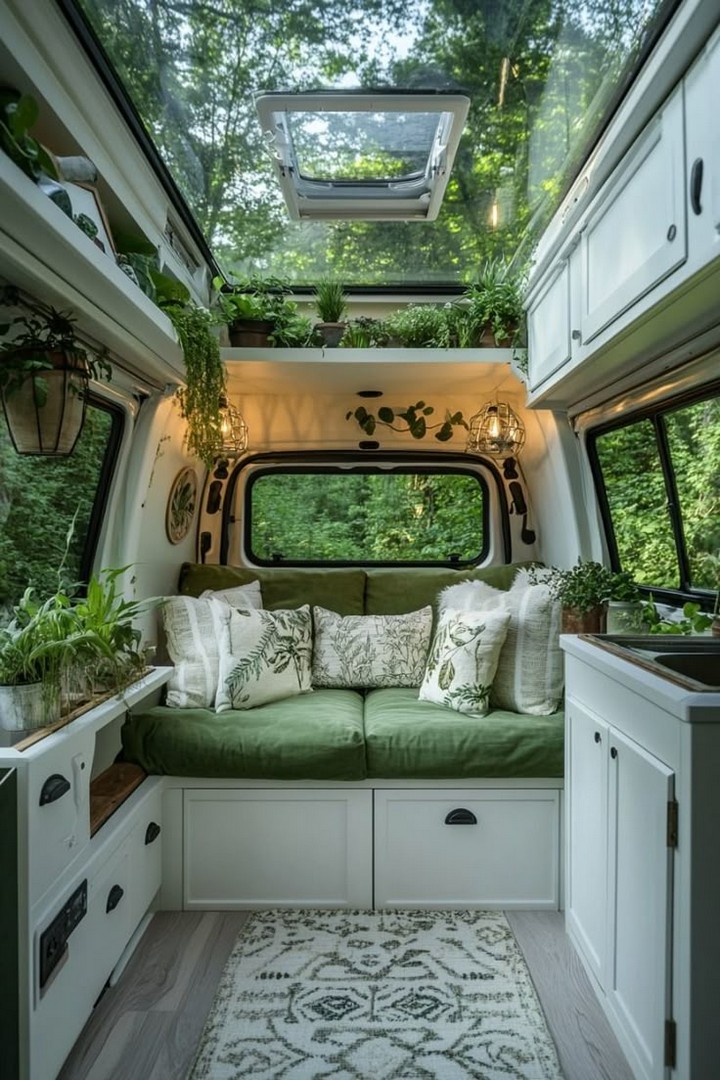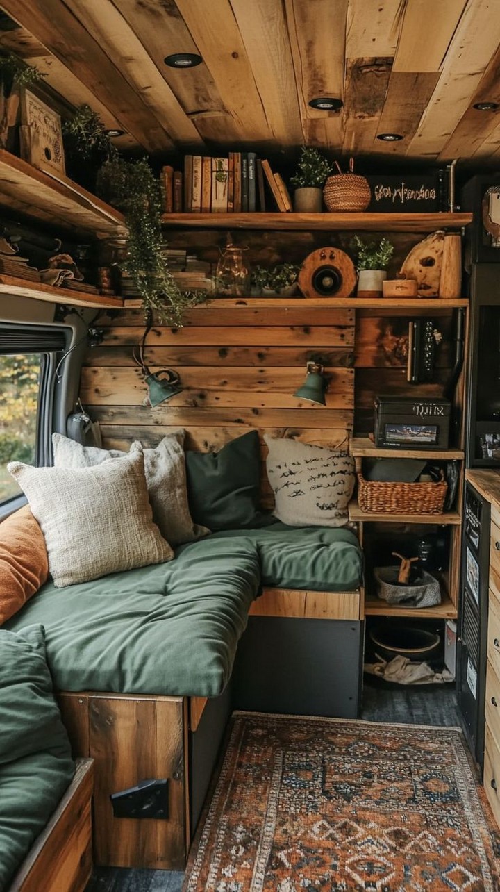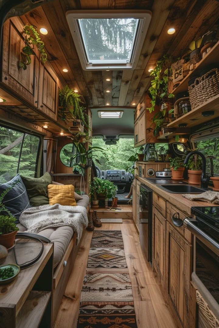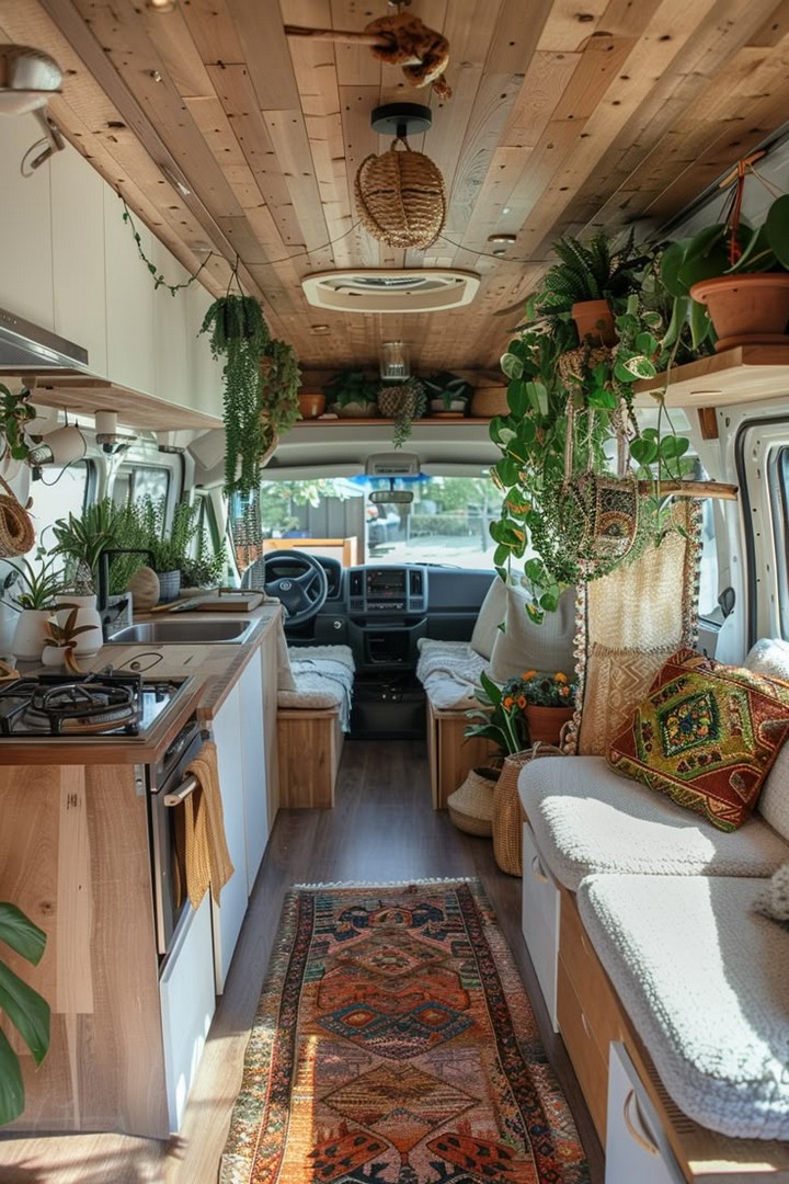 Make your van feel like home with cozy decor. Add rugs, throw blankets, wall art, and plants to personalize your space and make it inviting. Add a personal touch to your camper van interior with stylish and cozy decor. A cozy camper van with decorative pillows, rugs, and hanging plants.
