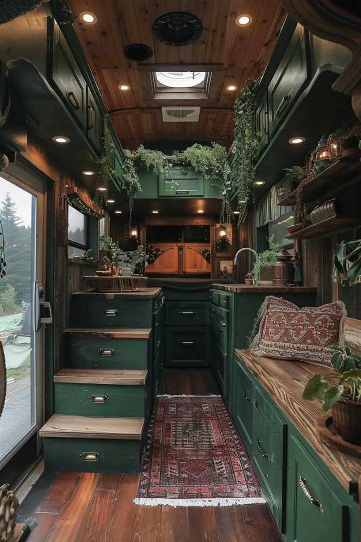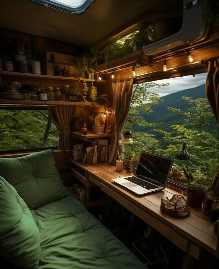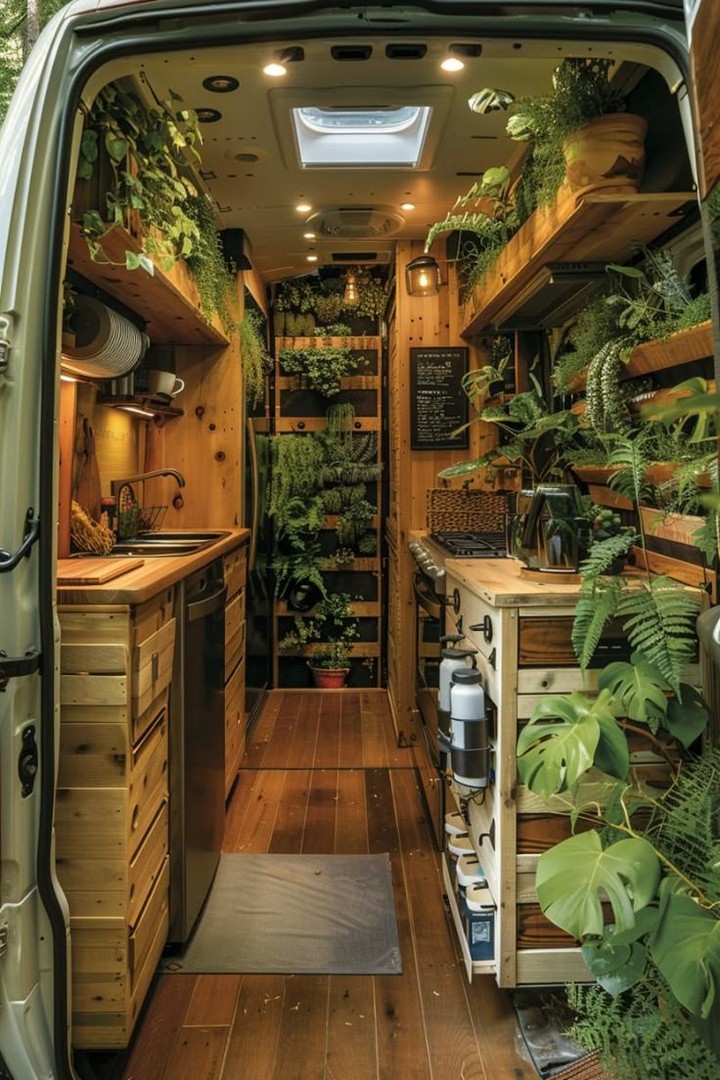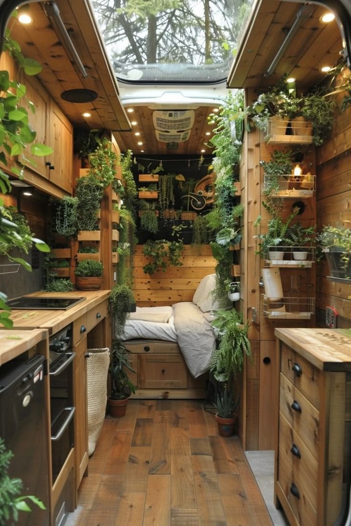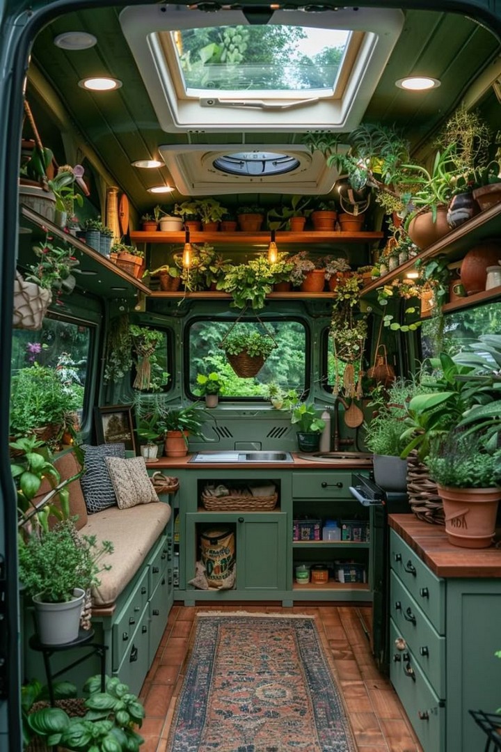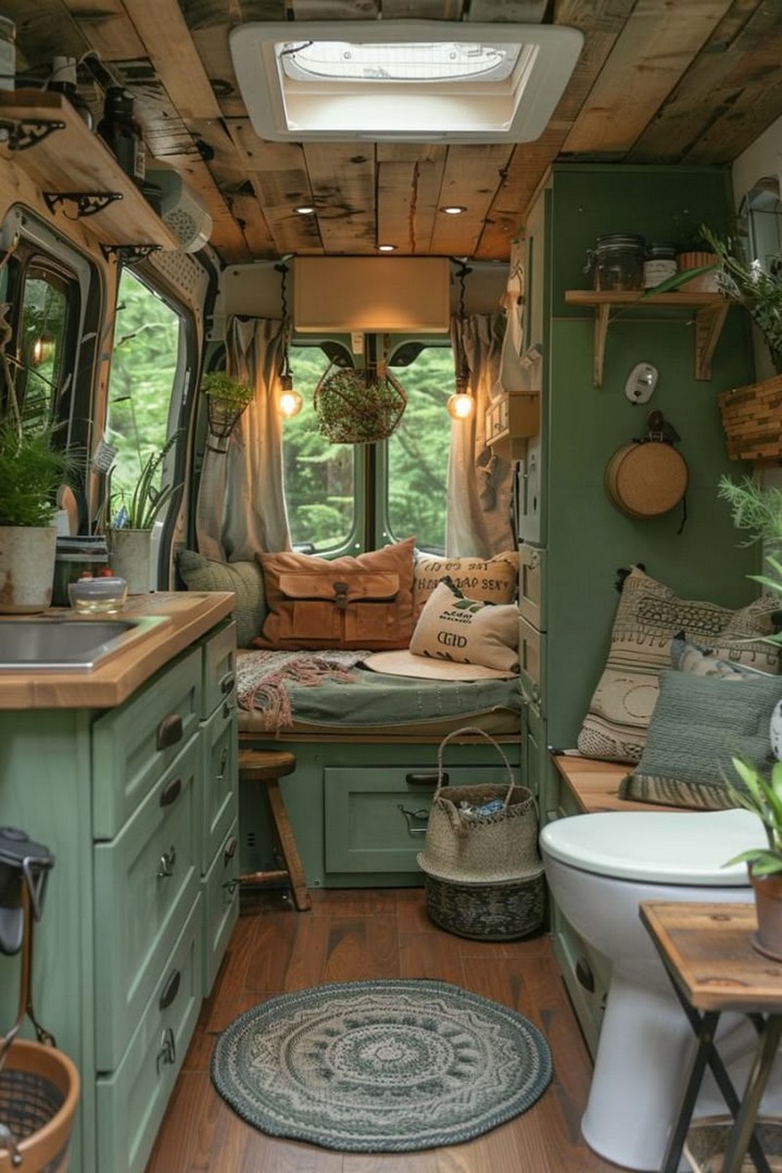 Make your van feel like home with cozy decor. Add rugs, throw blankets, wall art, and plants to personalize your space and make it inviting. Add a personal touch to your camper van interior with stylish and cozy decor. A cozy camper van with decorative pillows, rugs, and hanging plants.