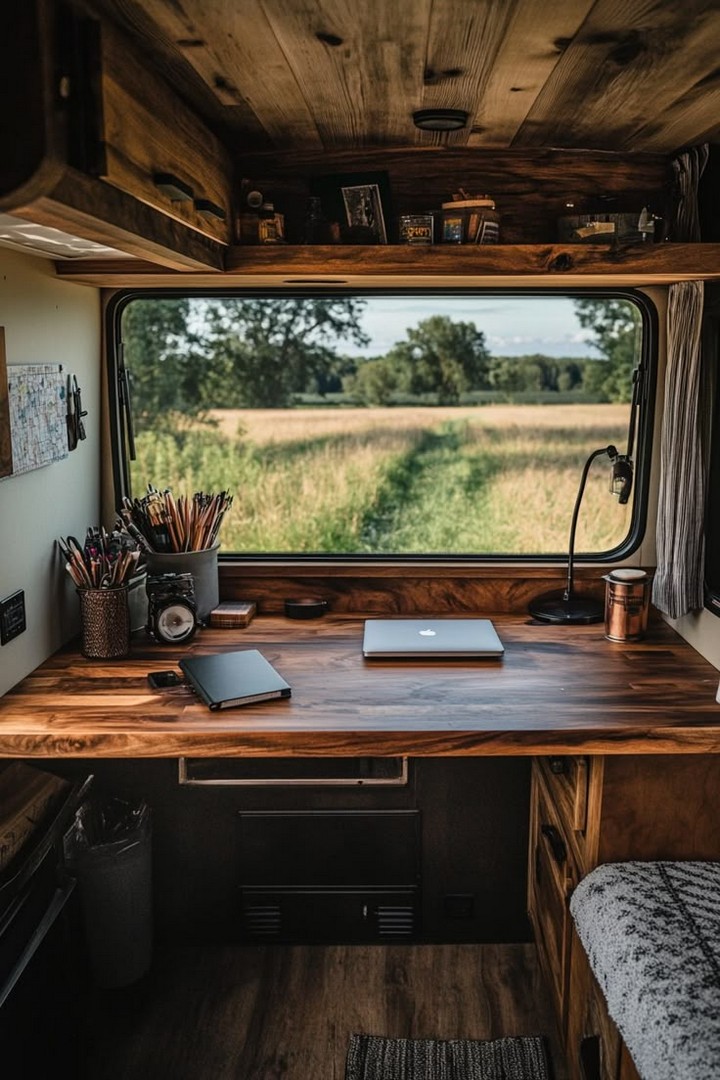 For digital nomads, a dedicated workspace is essential. Install a compact desk, ergonomic chair, and power outlets for an efficient remote work setup. Set up a mobile workstation in your camper van for productive remote work. A camper van interior featuring a small desk and laptop setup for remote work.
