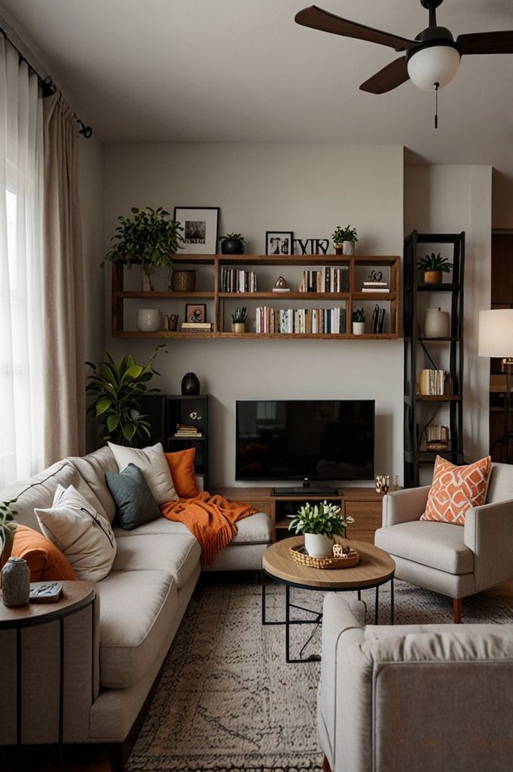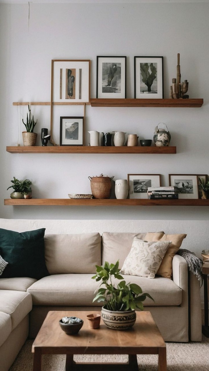 - Floating Shelves: Add a few floating shelves above the sofa for decor and storage without using valuable floor space.