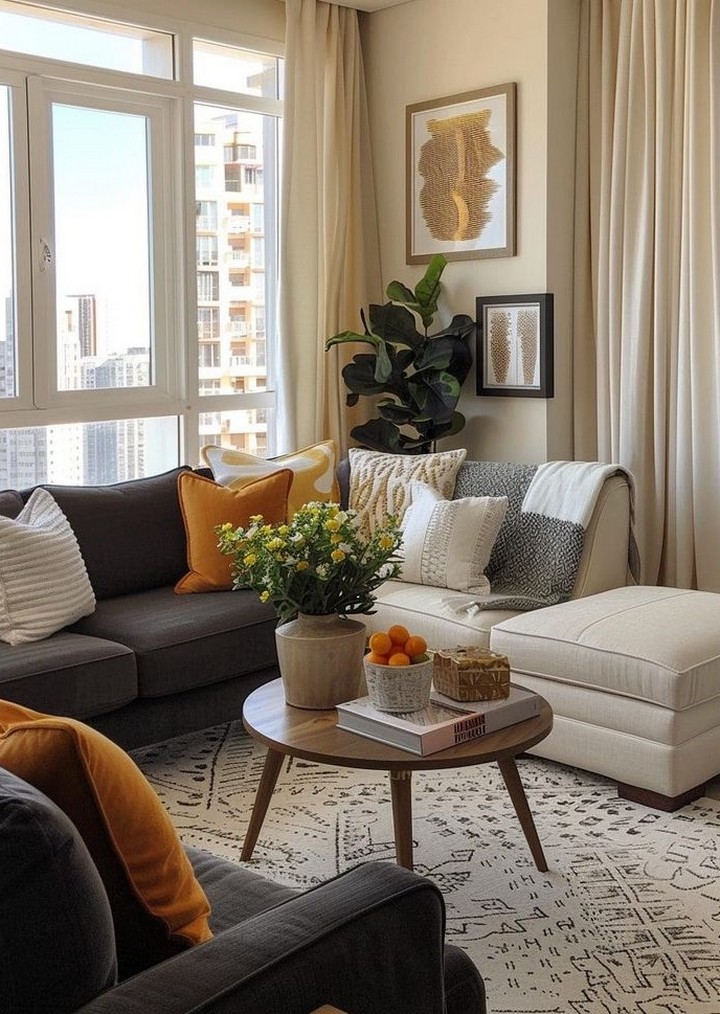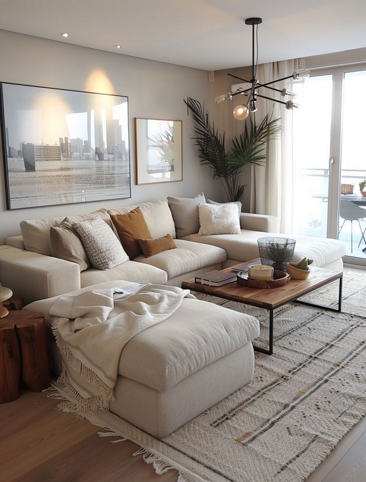 - Light and Neutral Tones: White, beige, and light gray are perfect for a small apartment living room, making the space feel airy and open.