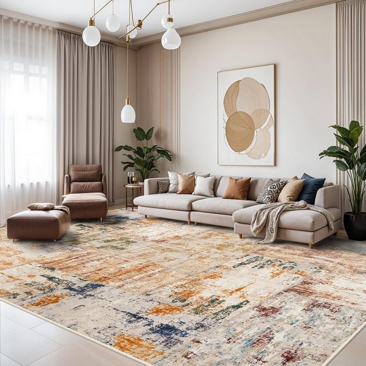 - Rugs: Use a large area rug to ground the seating area, defining it as a distinct space. In smaller rooms, choose light-colored rugs to keep things feeling open.