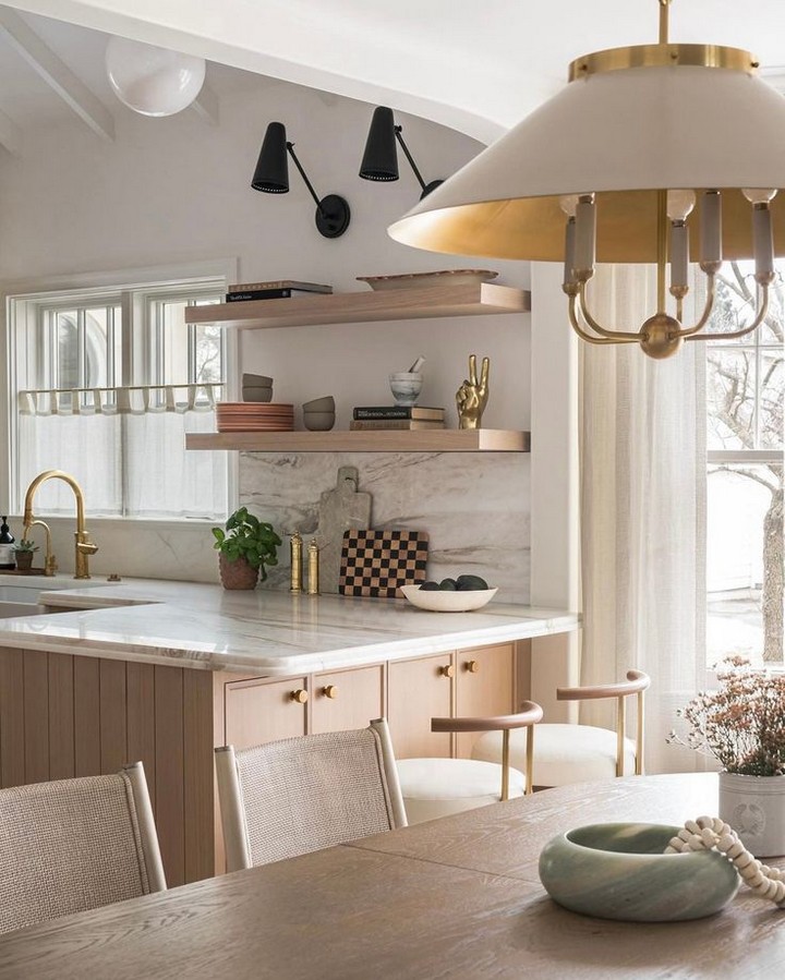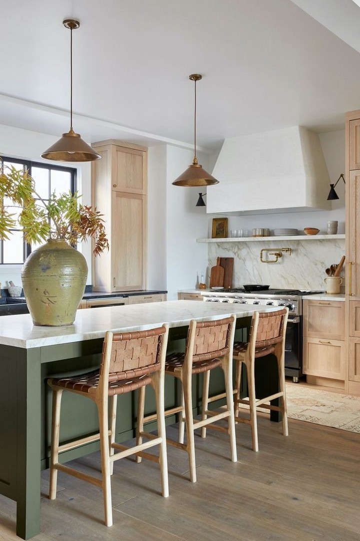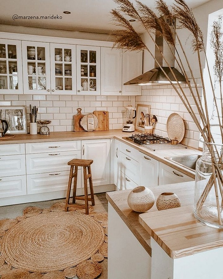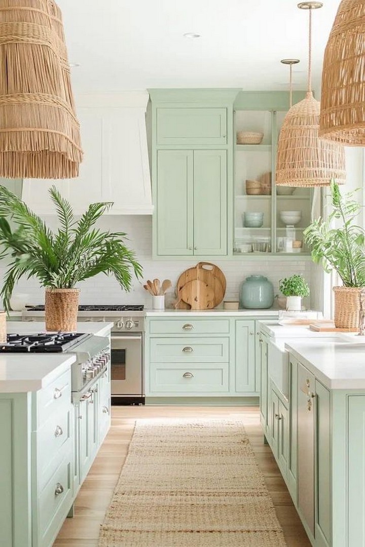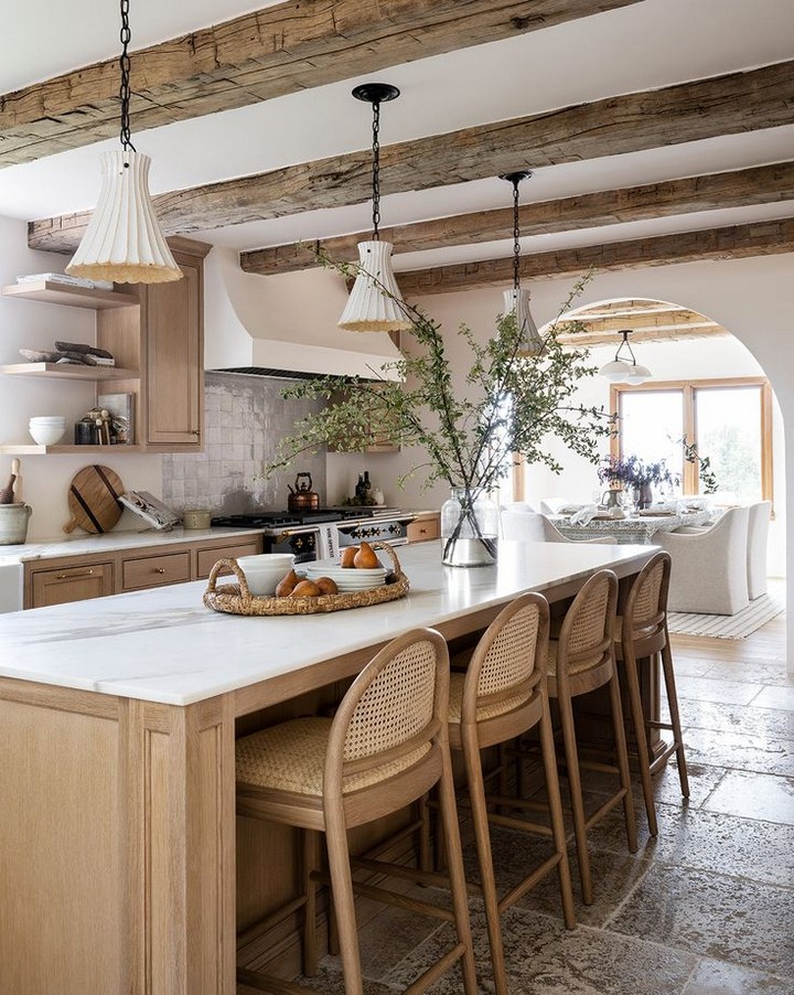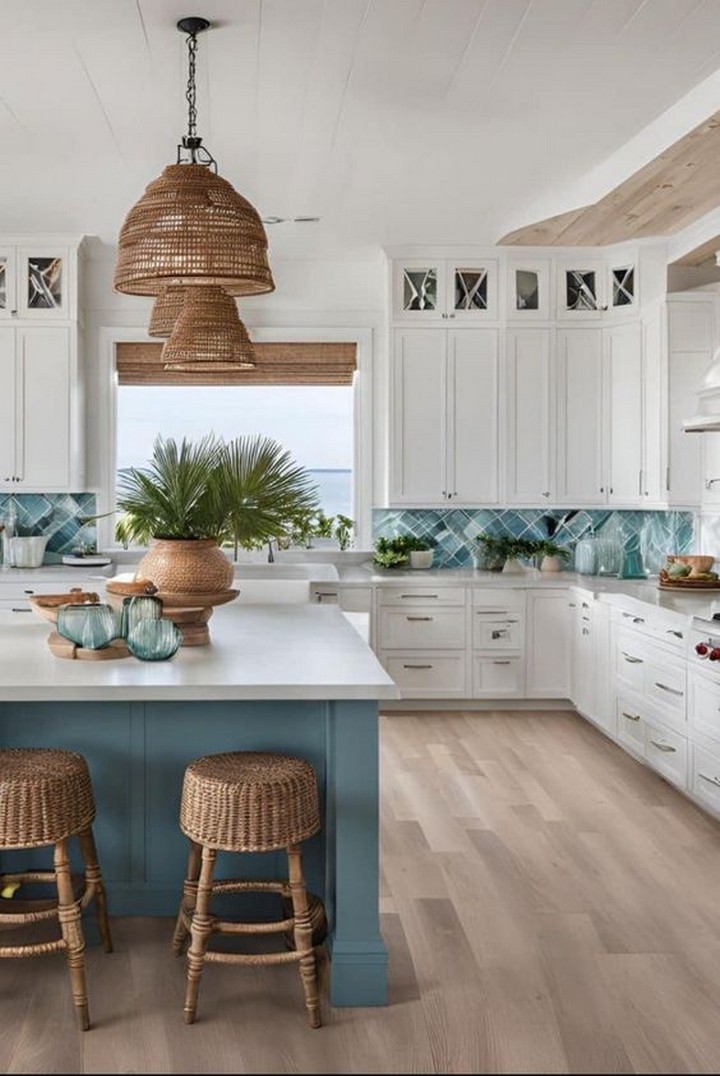 Introduce woven textures through rattan bar stools, seagrass pendant lights, jute rugs, and woven baskets to infuse your kitchen with a coastal vibe and a touch of relaxed sophistication.