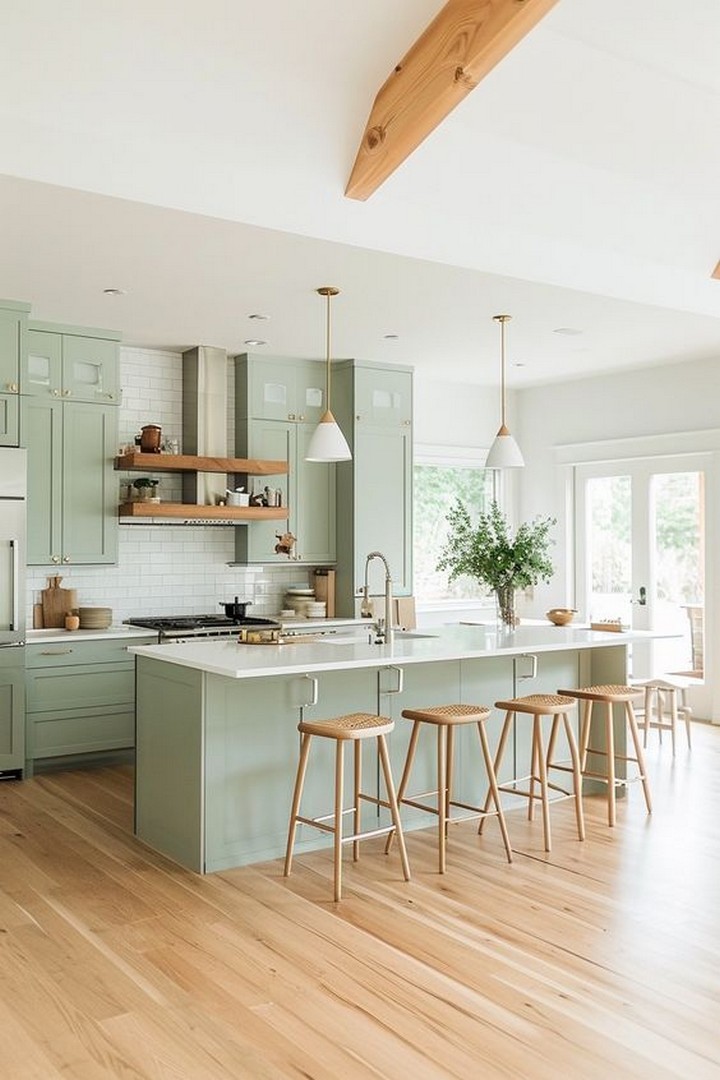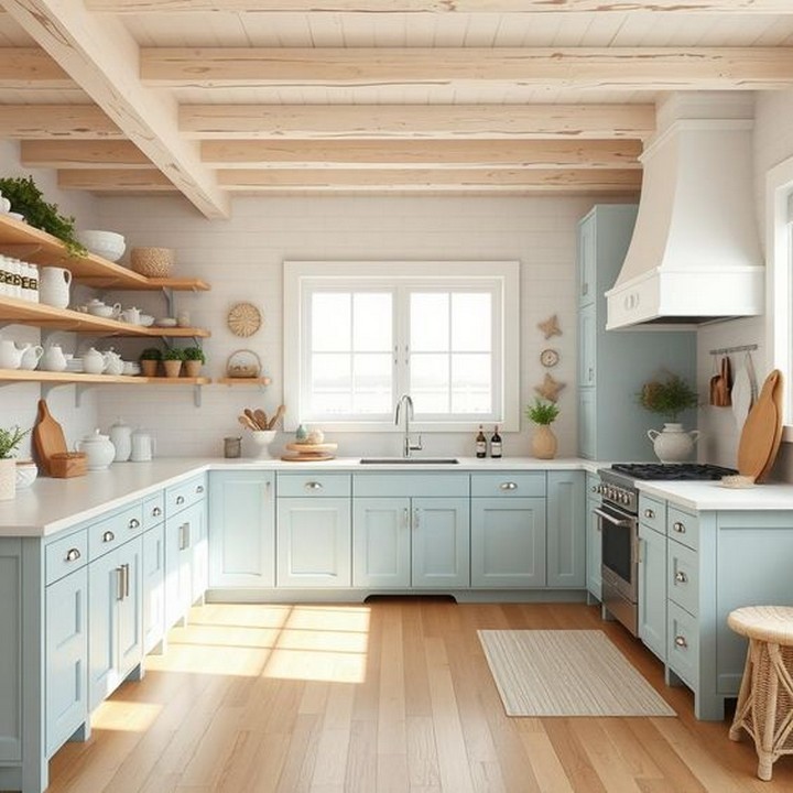 Choose flooring materials like bleached hardwood, whitewashed wood planks, or light-colored tiles with a driftwood-inspired finish to evoke the feeling of walking on sandy shores in your kitchen.