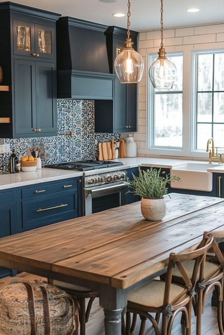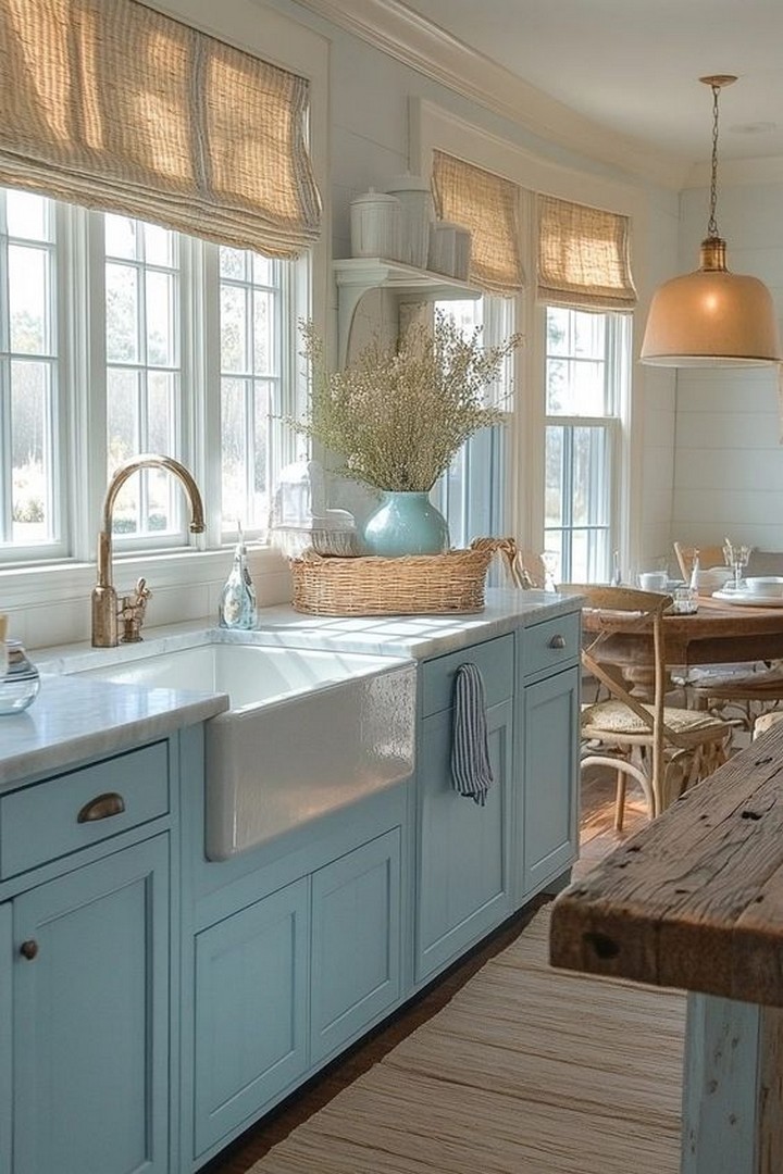 Incorporate blue and white patterns through curtains, upholstery, dish towels, or kitchen linens featuring stripes, checks, or coastal motifs to add a classic and refreshing element to your beach cottage kitchen.