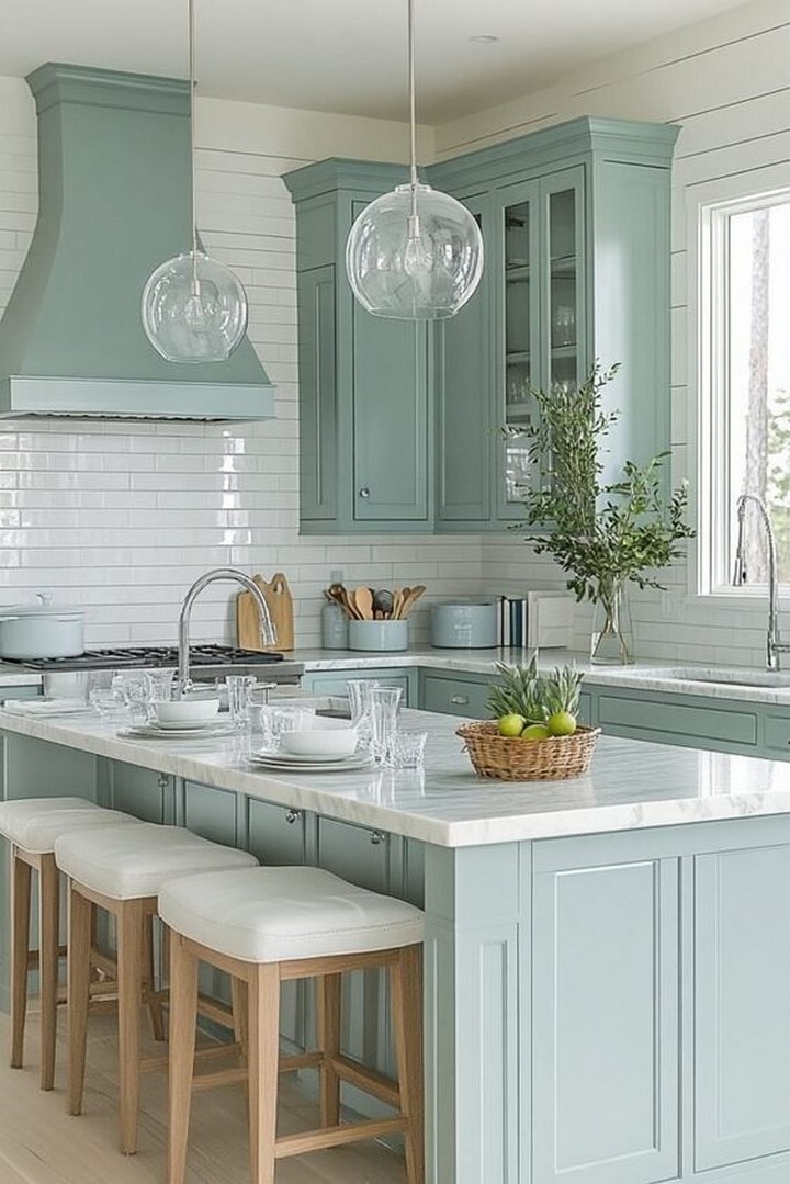 Bring the outdoors in by adding potted plants, tropical palms, succulents, or fresh flowers to your beach cottage kitchen to infuse the space with vibrant colors, organic textures, and a hint of paradise.