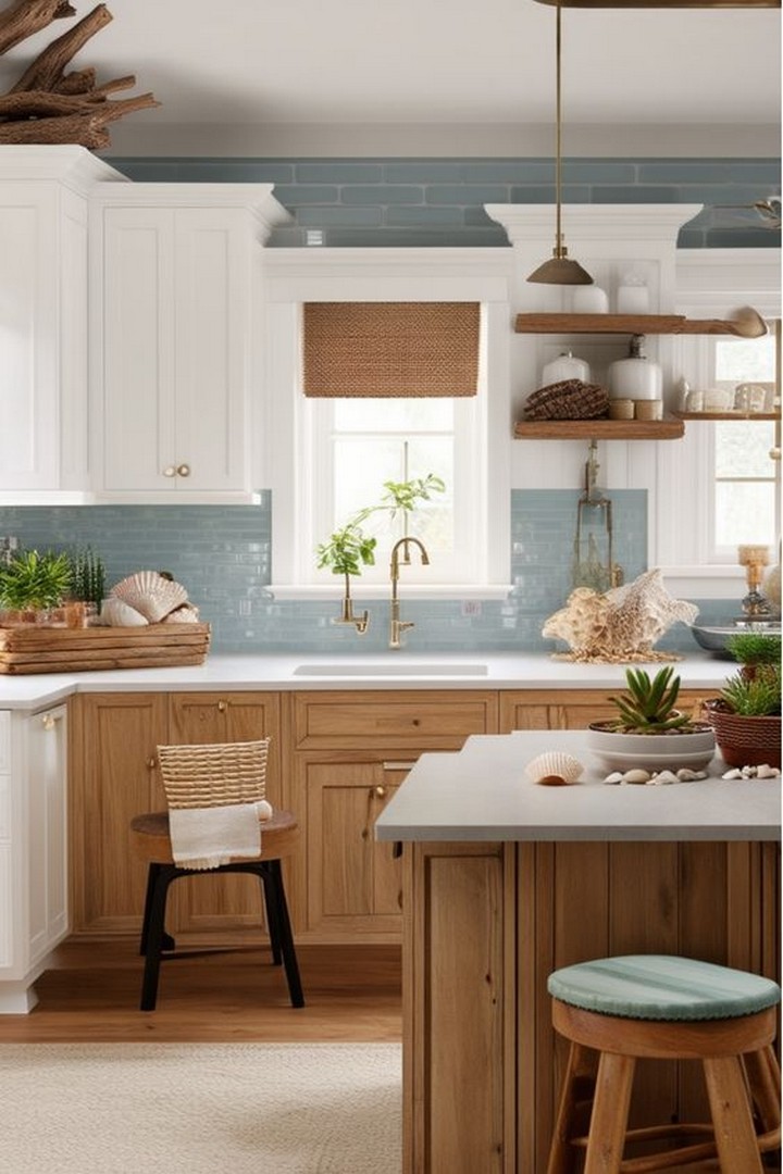 Opt for open shelving made of reclaimed wood or distressed metal to showcase beach-themed dinnerware, glassware, and decorative items while adding a casual and relaxed feel to the kitchen.