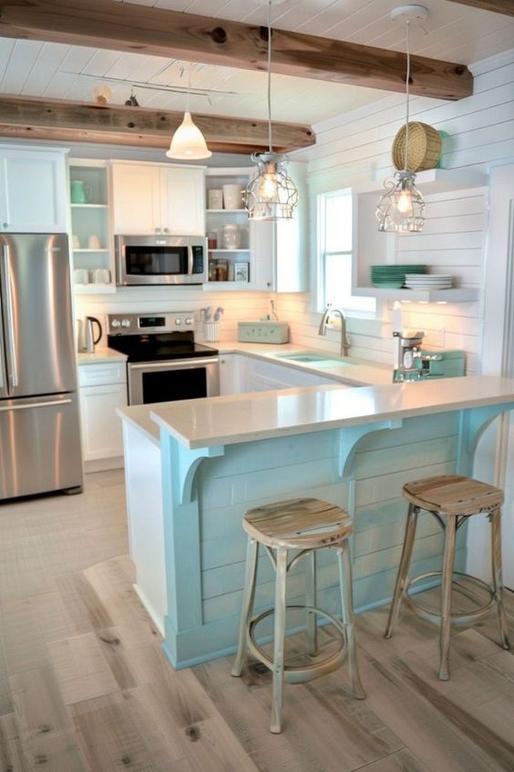 Incorporate weathered wood finishes for cabinets, flooring, and accents to add a touch of rustic charm and infuse your kitchen with the warmth and character of a cozy beach cottage.