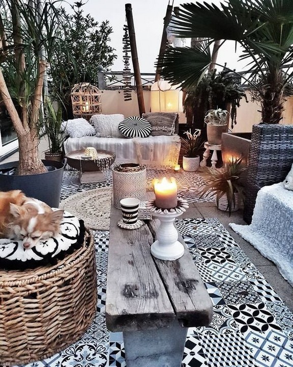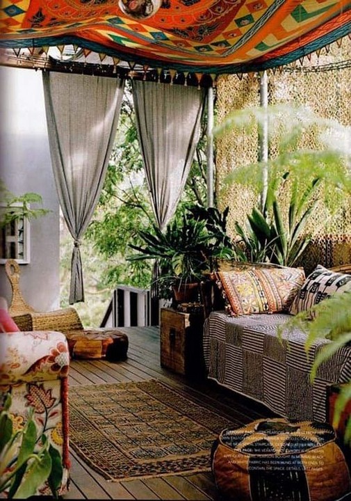 Incorporate vibrant, colorful fabrics through outdoor rugs, cushions, and hanging drapes. Look for patterns like paisley, Moroccan prints, and tie-dye.