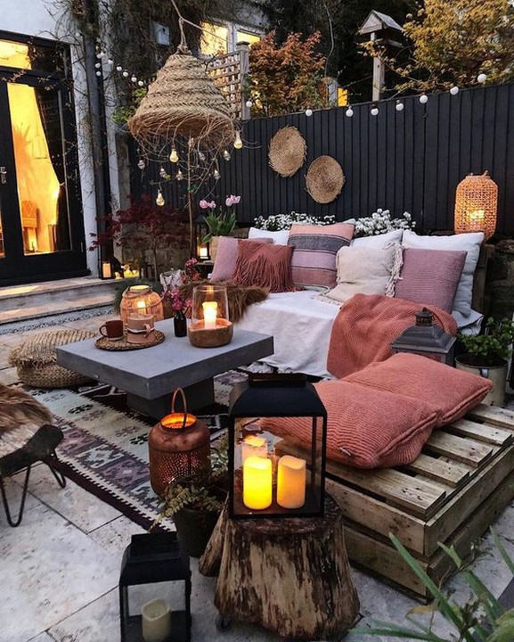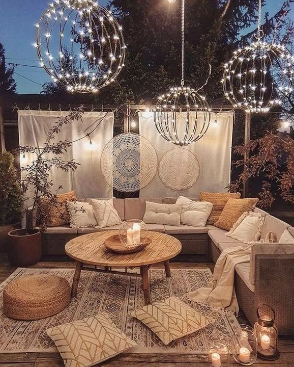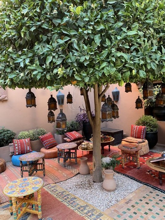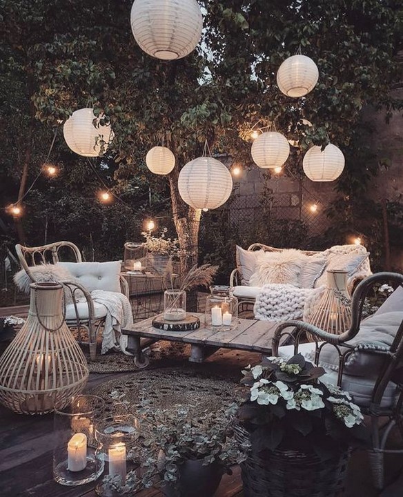 Hang Moroccan lanterns, string lights, and paper lanterns to create a warm and magical ambiance in the evenings.