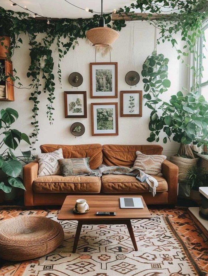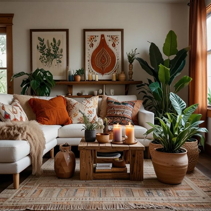 Bohemian decor shines through in the details. Accessories, art, and plants can bring your cozy living room to life: