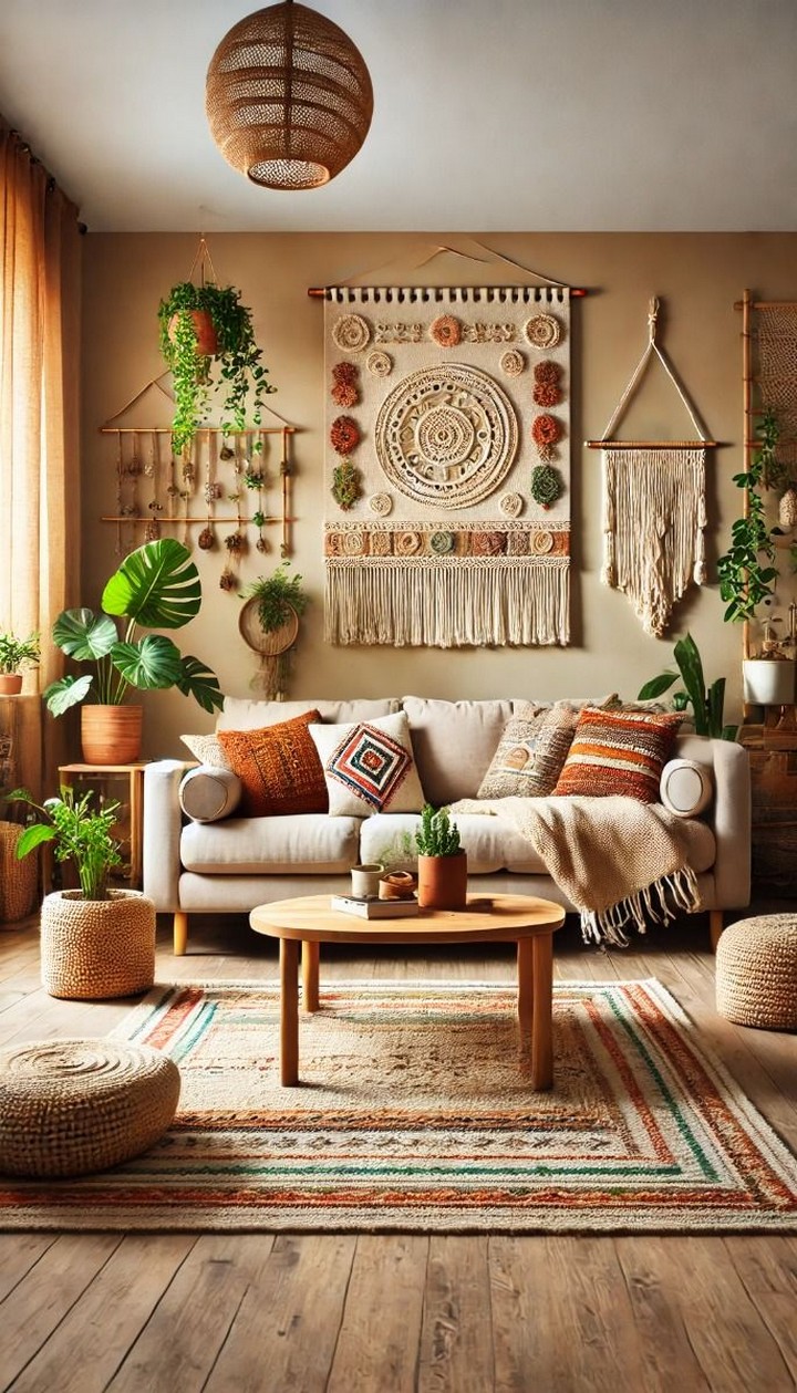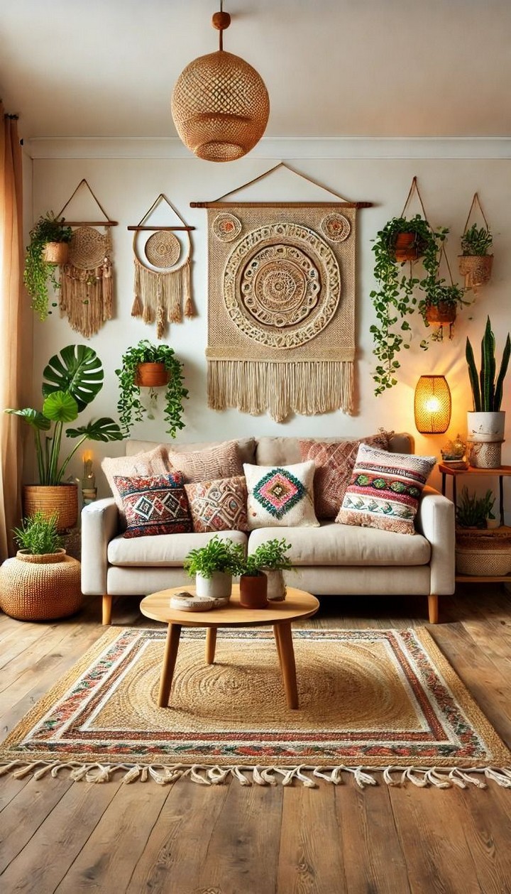 - Wall Art: Hang macrame wall hangings, woven baskets, or a gallery wall featuring eclectic prints and photos.