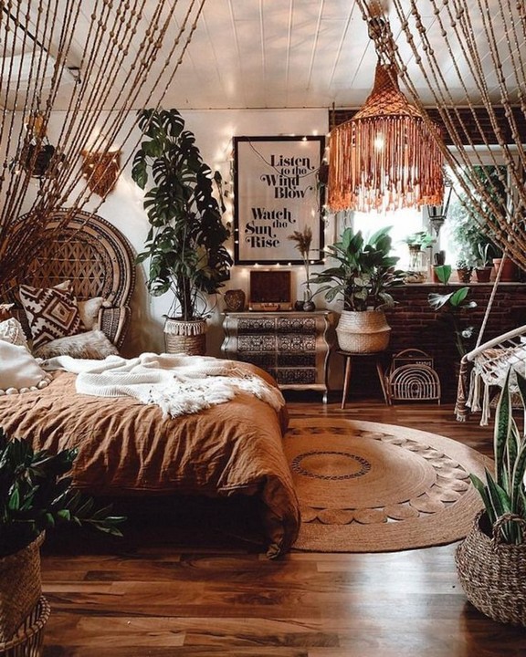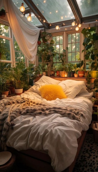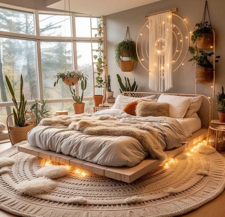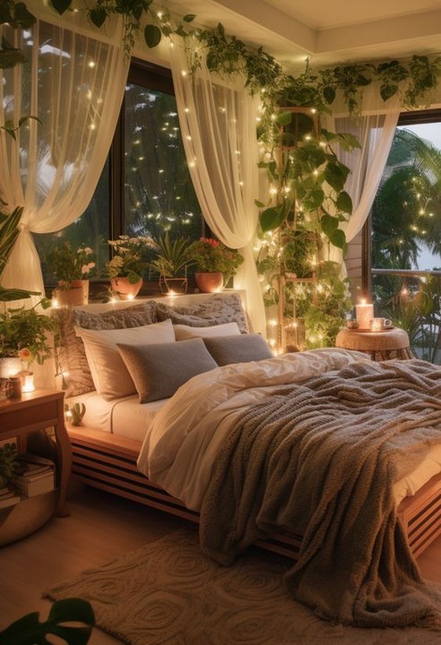 If you have a canopy bed, drape string lights along the canopy to create a dreamy, ethereal effect. Combine this with flowy curtains for a complete Boho look.