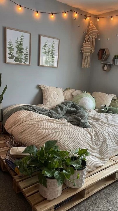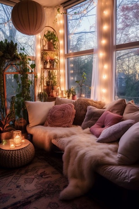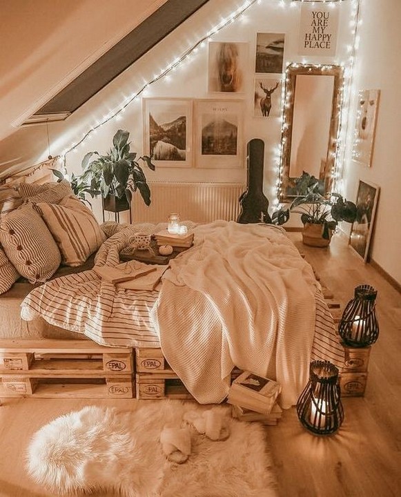 Hang string lights to add a whimsical and magical touch to your space. You can use fairy lights, globe lights, or Edison bulb string lights. Drape them around the headboard, along the ceiling, or create a canopy effect above your bed.