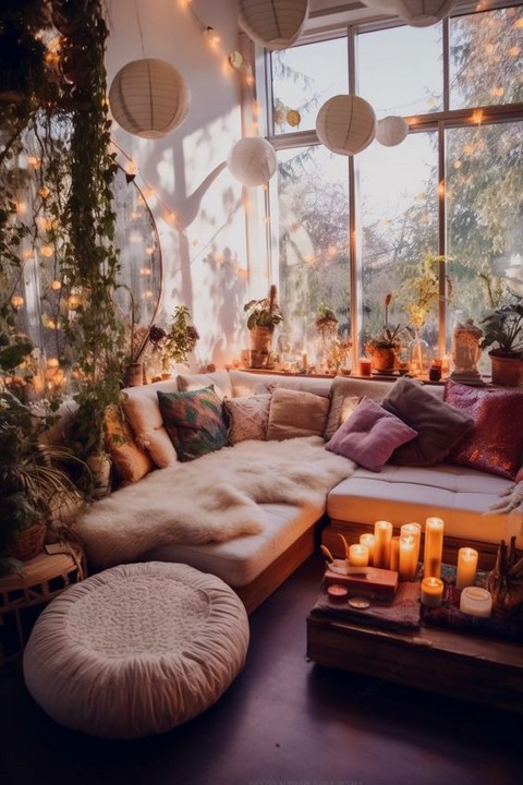 Complement the candle and string light decor with Boho-inspired wall art or tapestries. These can add to the ambiance and tie the overall theme together.