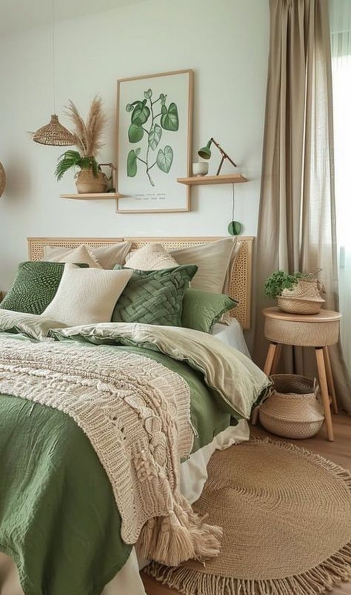 Introduce light-filtering linen curtains in washed sage green. They gently diffuse sunlight and soften hard lines in the room. Their airy nature complements the breezy, lived-in look of a boho bedroom while subtly reinforcing your green-toned theme.